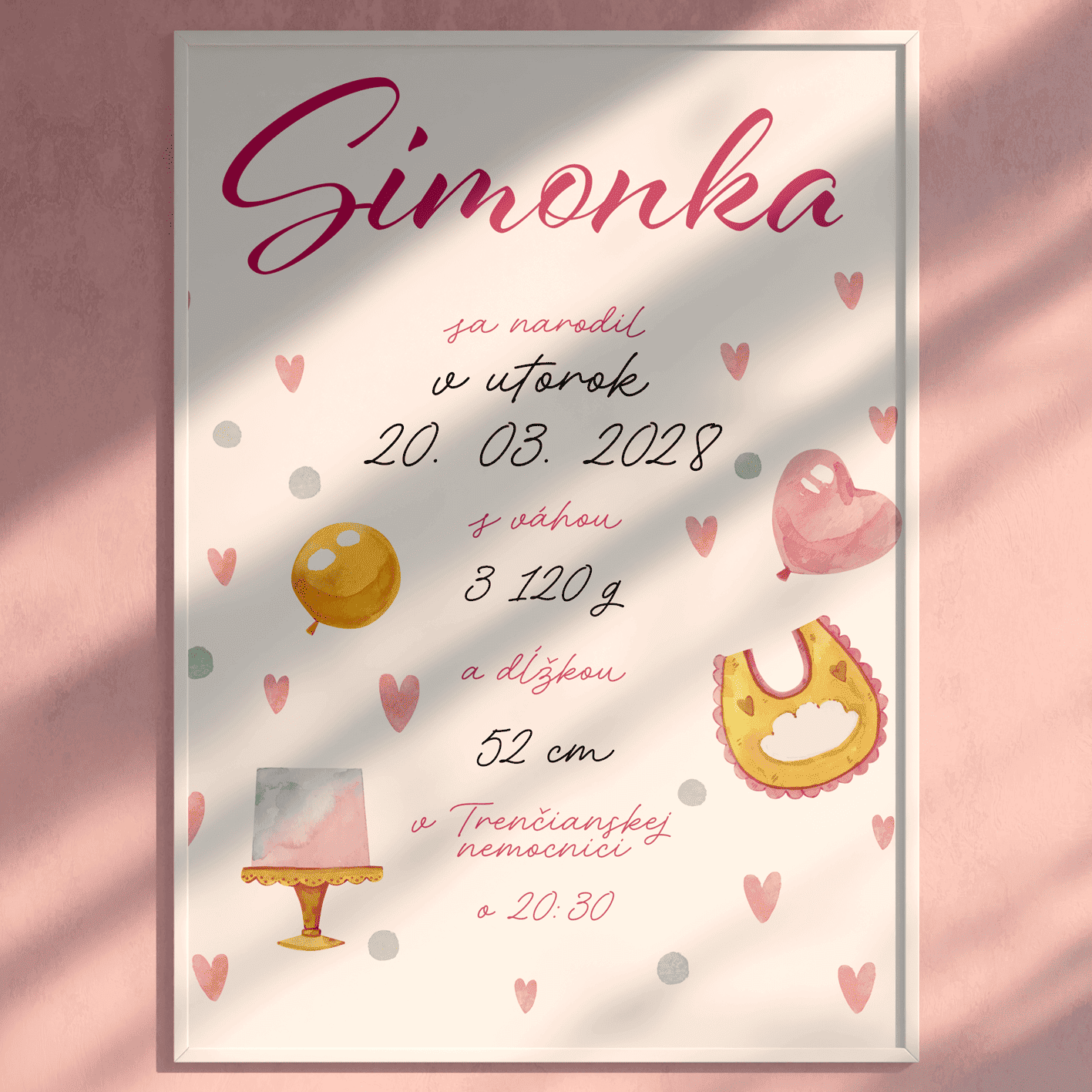 Jednou z najkrajších a najosobnejších možností je pamätná tabuľka o narodení. Spojí všetky údaje o narodení dieťaťa do jedného dizajnu: meno, dátum, čas, váhu, dĺžku, ba dokonca aj fotku. Viete k nej pridať aj krátke básničky pri narodení bábätka, osobný verš k narodeniu bábätka alebo jednoduchý nápis „Gratulujeme k narodeniu bábätka“.