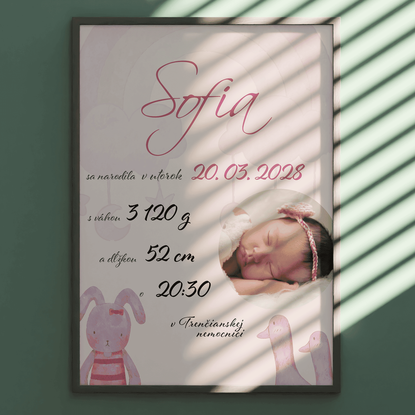 Narodenie dieťaťa je okamih, na ktorý nezabudnete celý život. Aby ste mali tieto vzácne spomienky uchované navždy, pripravíme pre vás originálnu pamätnú tabuľku o narodení. Obsahuje všetky údaje o vašom bábätku a vďaka krásnej grafike sa stane jedinečnou dekoráciou aj darčekom.