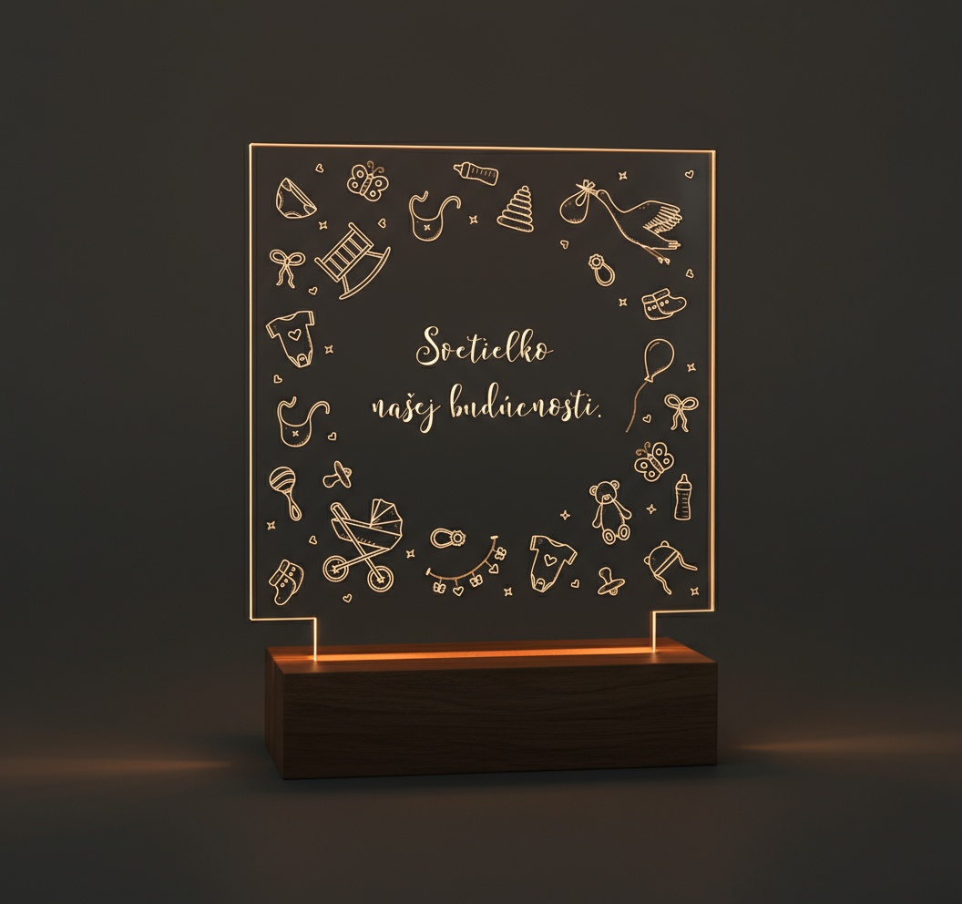 Naša darčeková svietiaca lampa je jedinečný, personalizovaný darček, ktorý hovorí namiesto slov. Vyrobená z kvalitného akrylu a osadená do elegantného LED podstavca, vytvára teplé, príjemné svetlo, ktoré rozžiari každý deň – aj srdce obdarovaného.