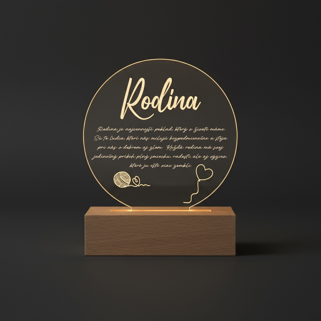 Naša darčeková svietiaca lampa je jedinečný, personalizovaný darček, ktorý hovorí namiesto slov. Vyrobená z kvalitného akrylu a osadená do elegantného LED podstavca, vytvára teplé, príjemné svetlo, ktoré rozžiari každý deň – aj srdce obdarovaného.