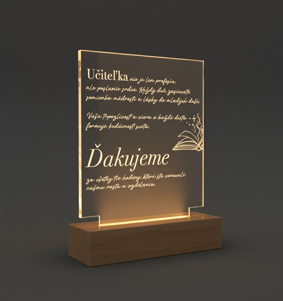 Naša darčeková svietiaca lampa je jedinečný, personalizovaný darček, ktorý hovorí namiesto slov. Vyrobená z kvalitného akrylu a osadená do elegantného LED podstavca, vytvára teplé, príjemné svetlo, ktoré rozžiari každý deň – aj srdce obdarovaného.
