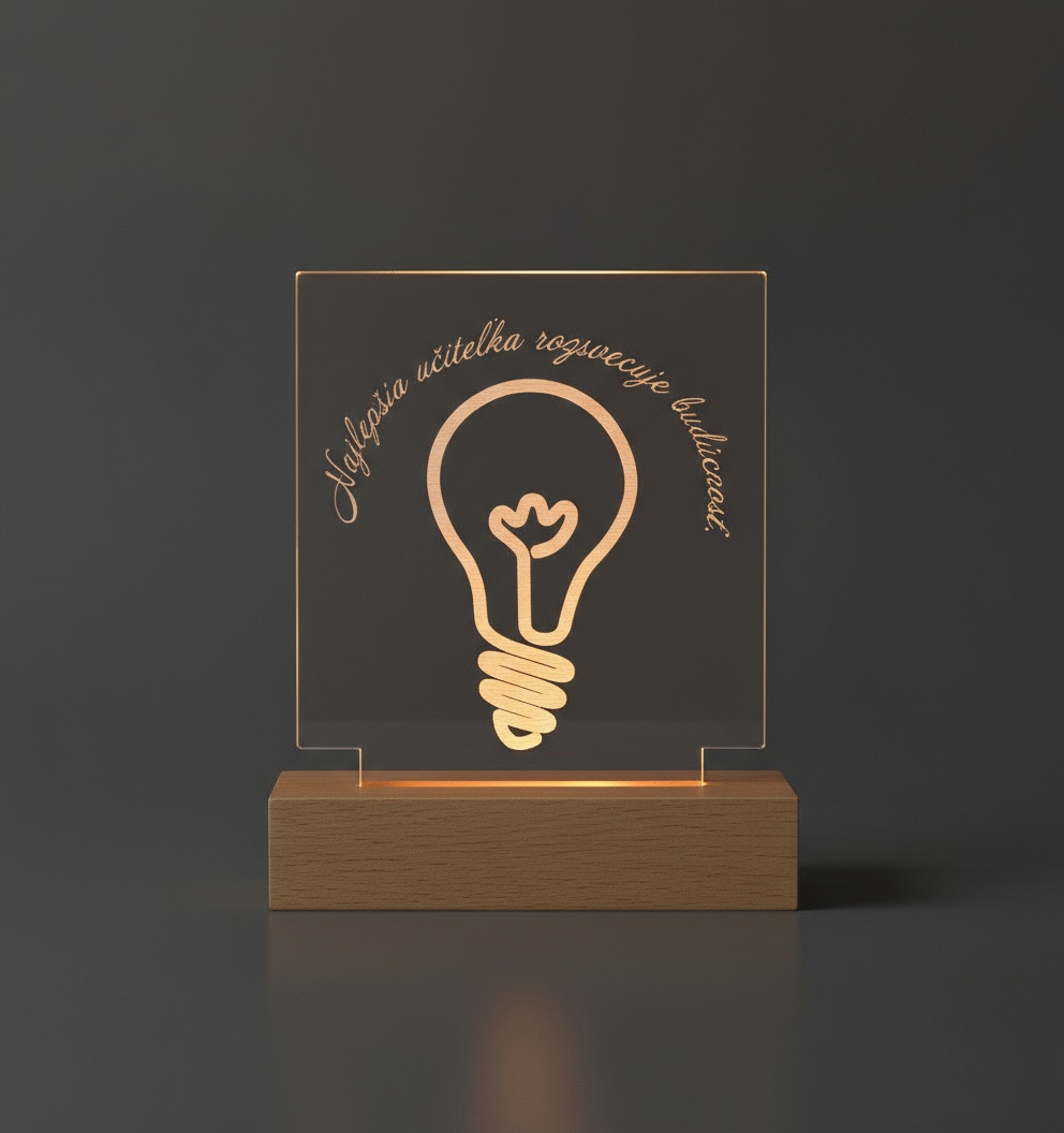 Naša darčeková svietiaca lampa je jedinečný, personalizovaný darček, ktorý hovorí namiesto slov. Vyrobená z kvalitného akrylu a osadená do elegantného LED podstavca, vytvára teplé, príjemné svetlo, ktoré rozžiari každý deň – aj srdce obdarovaného.