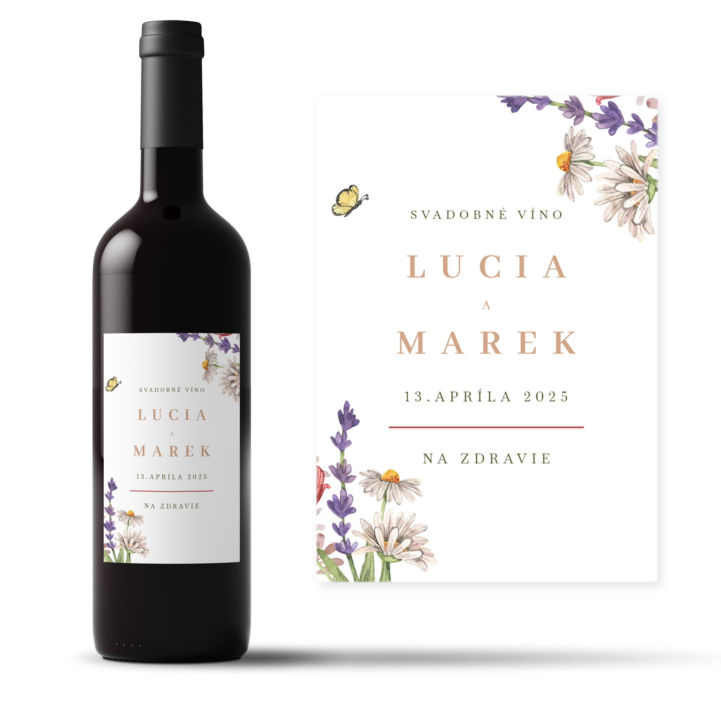 Etiketa na svadobné víno s motýľom a kvetmi Skip to main content