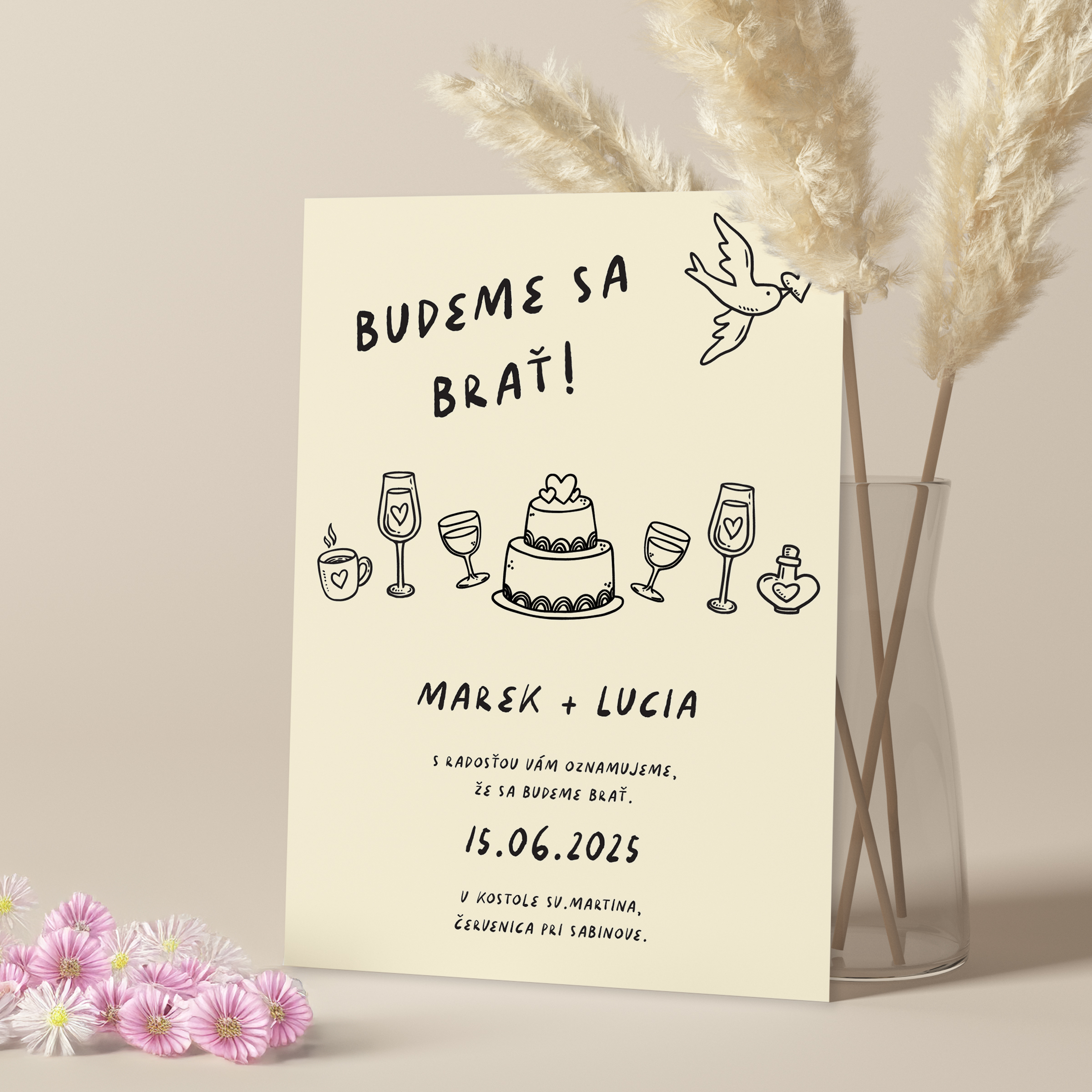 Jednoduché svadobné oznámenie v minimalistickom štýle s ikonkami torty a svadobných pohárov.