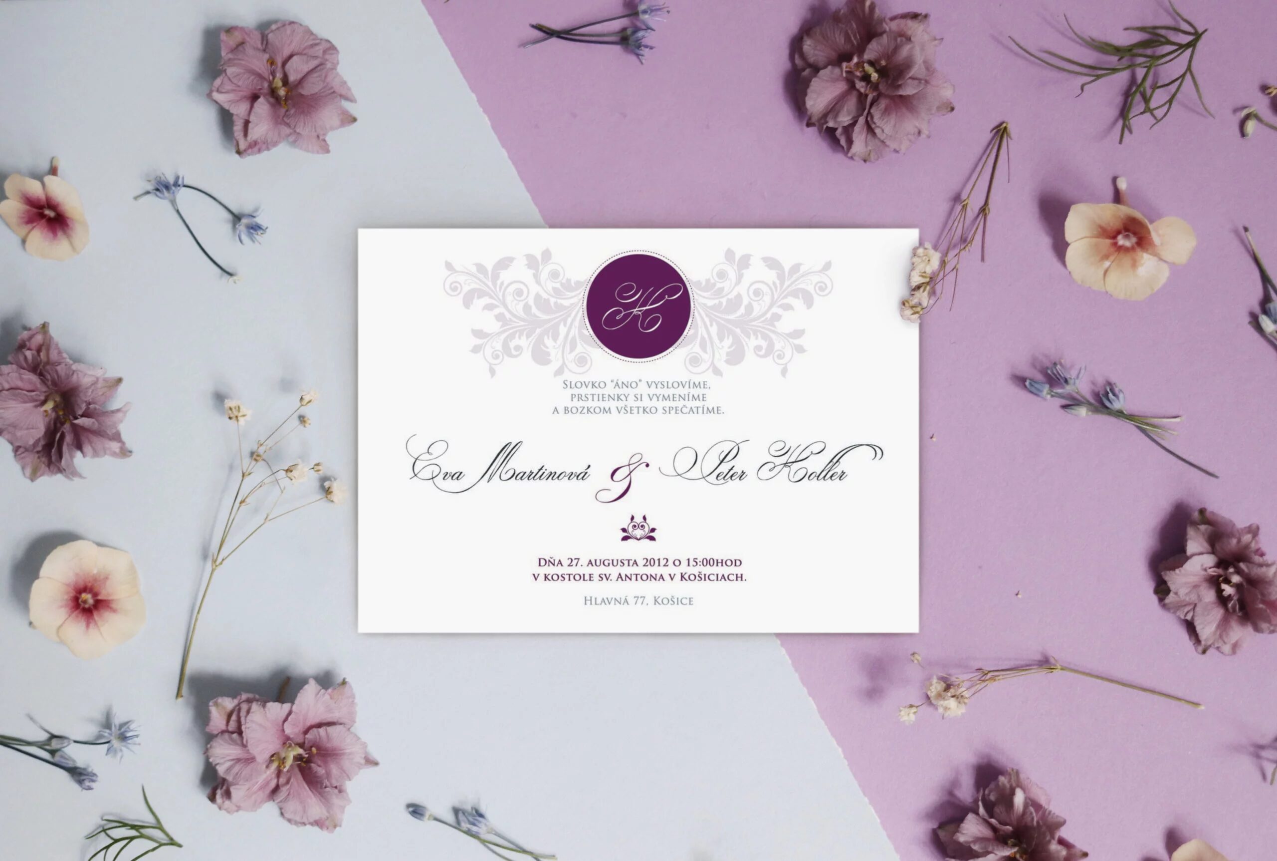 Nenápadne krásne svadobné oznámenie na bielom podklade. Vrátane krásneho písma vyniká ozdobným motívom v hornej časti.Svadobné oznámenie formát A6, pozvánku máte v tom istom štýle, ako aj všetky ďalšie tlačoviny. Tlačené na 250g papieri. Potlač je jednostranná, ale je možné potlačiť aj zadnú stranu. Vieme zmeniť farby aj formát na požiadanie.