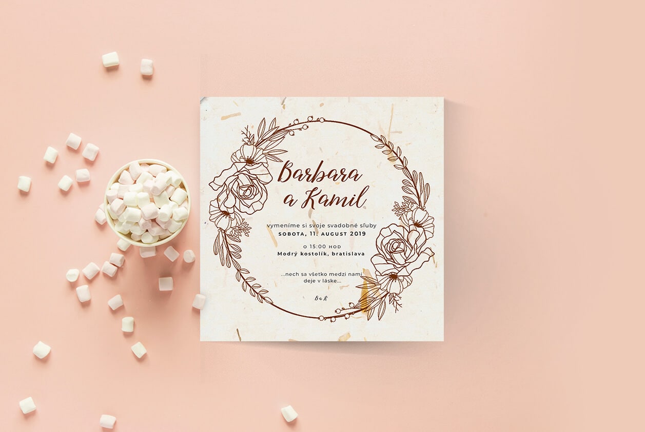 Jednoduché svadobné oznámenie s kvetinovým kruhom tvoreným obrysmi kvetov a listov ruží, na podklade béžového recyklovaného papiera.Svadobné oznámenie formát A6, pozvánku máte v tom istom štýle, ako aj všetky ďalšie tlačoviny. Tlačené na 250g papieri. Potlač je jednostranná, ale je možné potlačiť aj zadnú stranu. Vieme zmeniť farby aj formát na požiadanie.