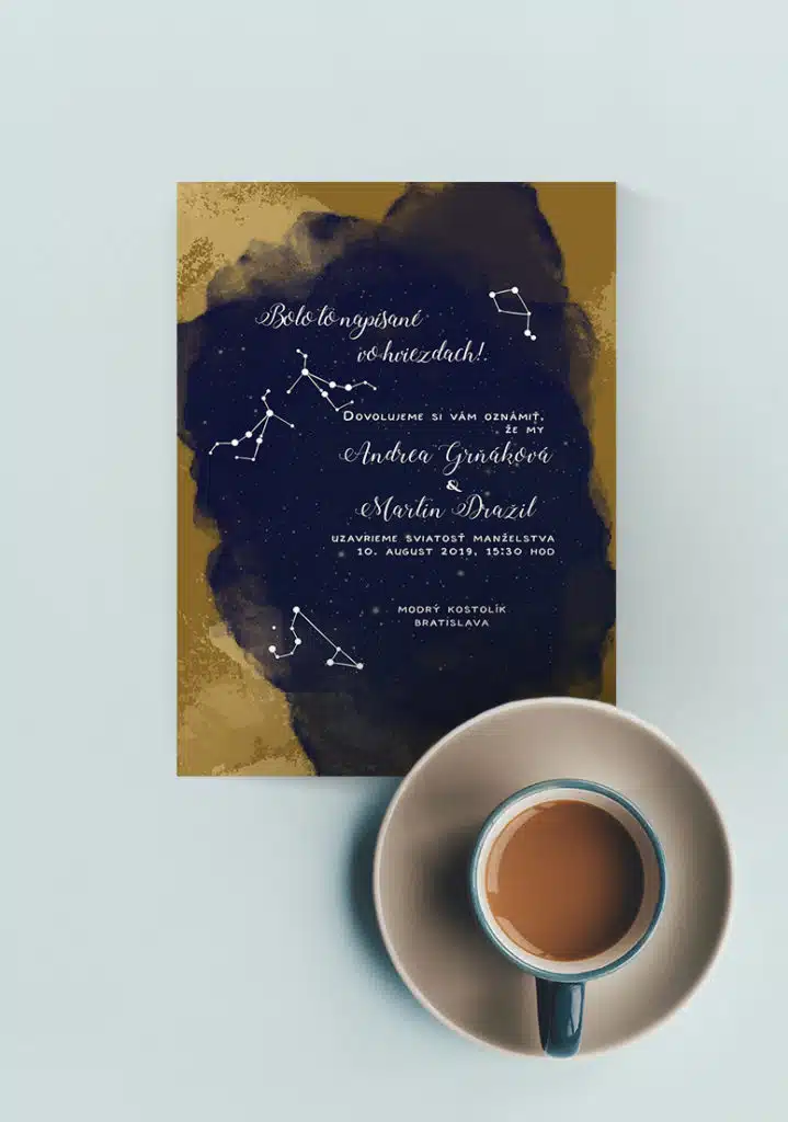 Bolo to písané vo hviezdach, že sa vaše duše stretnú. Bol to váš osud a dnes ho žijete. Spolu, bok po boku. Ktovie, čo vás ešte na spoločnej ceste čaká. Podstatné je, že stojíte vedľa seba a toto svadobné oznámenie s nočnou oblohou vám pomôže odštartovať spoločný manželský život,Svadobné oznámenie formát A6, pozvánku máte v tom istom štýle, ako aj všetky ďalšie tlačoviny. Tlačené na 250g papieri. Potlač je jednostranná, ale je možné potlačiť aj zadnú stranu. Vieme zmeniť farby aj formát na požiadanie.