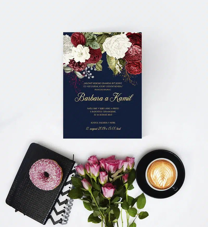 Kvetinové svadobné oznámenie v štýle burgundy so zlatým písmom. Skvost medzi svadobnými oznámeniami.Svadobné oznámenie formát A6, pozvánku máte v tom istom štýle, ako aj všetky ďalšie tlačoviny. Tlačené na 250g papieri. Potlač je jednostranná, ale je možné potlačiť aj zadnú stranu. Vieme zmeniť farby aj formát na požiadanie.