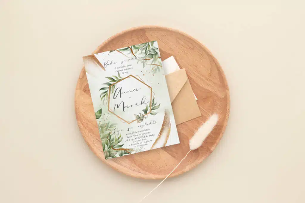 Svadobné oznámenie so zelenými lístkami, trend tejto sezóny. Je svieže, moderné a má štýl. Nadchne svojou dynamikou a nadčasovým dizajnom.