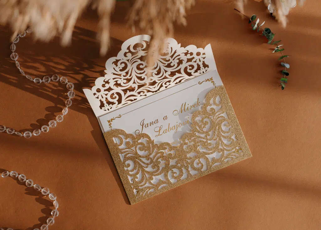 Krásne zlaté alebo strieborné svadobné oznámenie s laserom vyrezávanými florálnymi ornamentami, v tvare obálky. Pôsobivé otváranie, prémiový papier a kvalitná tlač predpovedá očarujúci výsledok.