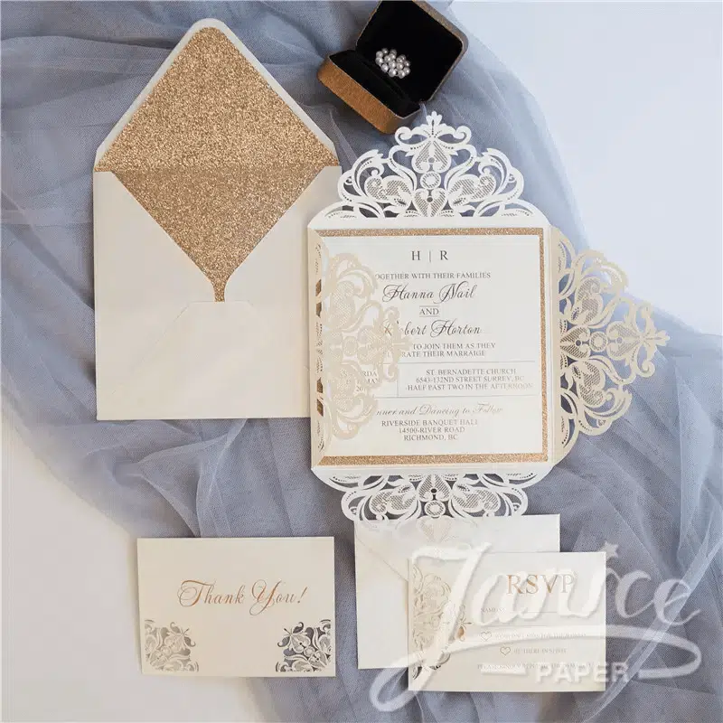 Krásne kráľovské svadobné oznámenie s laserom vyrezávanými florálnymi ornamentami. Pôsobivé otváranie, prémiový papier a kvalitná tlač predpovedá očarujúci výsledok.