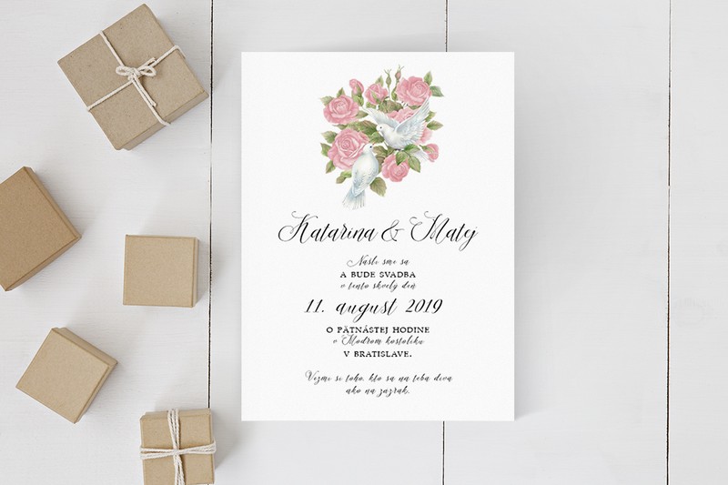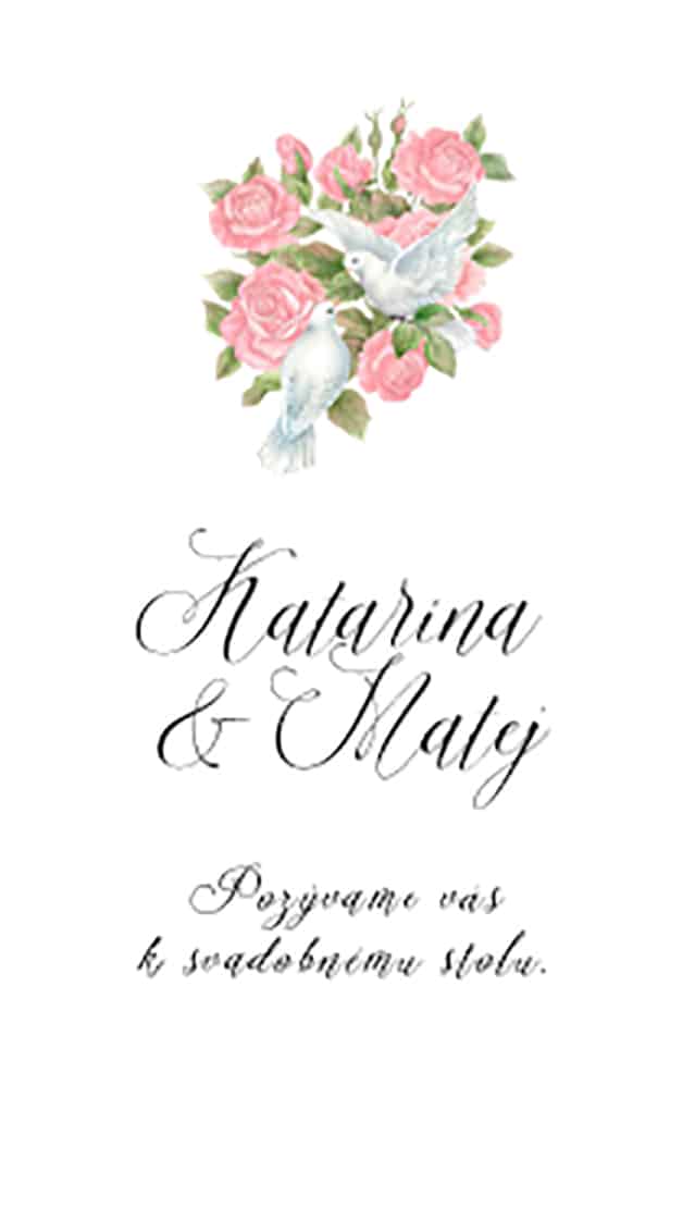 Holubice boli od nepamäti vyobrazované v spojení s mierom, nádejou, láskou a čistotou. A vzťah dvoch ľudí žijúcich v harmónii má presne tieto charakteristiky.Svadobné oznámenie formát A6, pozvánku máte v tom istom štýle, ako aj všetky ďalšie tlačoviny. Tlačené na 250g papieri. Potlač je jednostranná, ale je možné potlačiť aj zadnú stranu. Vieme zmeniť farby aj formát na požiadanie.