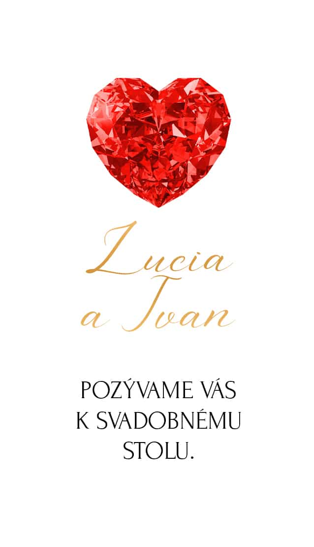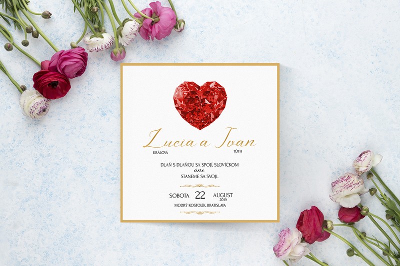 Diamantové srdce ako z príbehu o Titanicu je dominantou tohto luxusného svadobného oznámenia.Svadobné oznámenie formát 14x14cm, pozvánku máte v tom istom štýle, ako aj všetky ďalšie tlačoviny. Tlačené na 300g papieri. Potlač je jednostranná, ale je možné potlačiť aj zadnú stranu. Vieme zmeniť farby aj formát na požiadanie.