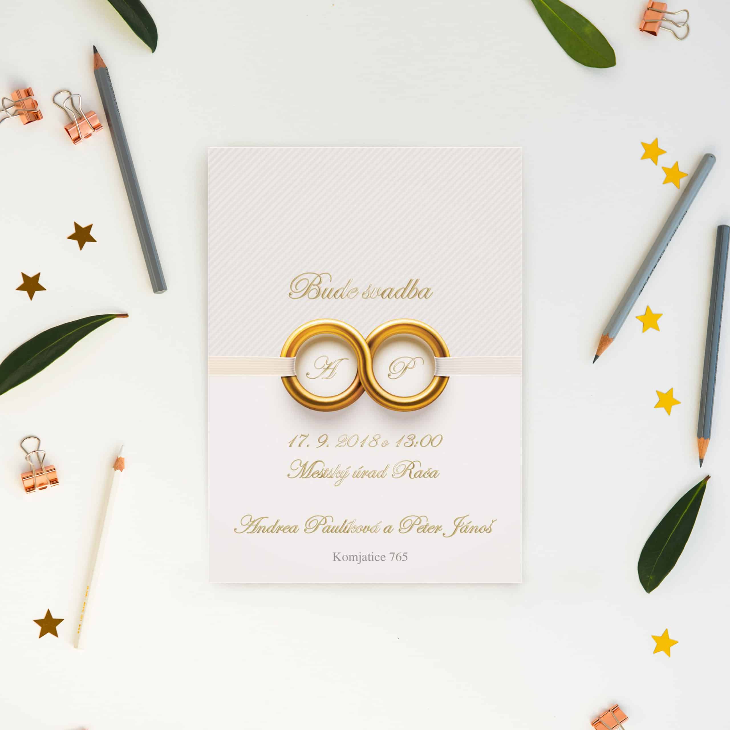 Kartičkové svadobné oznámenie, ktoré tlmočí ideu nerozlučiteľnosti manželského zväzku prostredníctvom symboliky obrúčok ako hlavného motívu oznámenia. Metalický font písma spolu s kombinovaným podkladom ponúkajú vkusnú krásu.Svadobné oznámenie formát A6, pozvánku máte v tom istom štýle, ako aj všetky ďalšie tlačoviny. Tlačené na 250g papieri. Potlač je jednostranná, ale je možné potlačiť aj zadnú stranu. Vieme zmeniť farby aj formát na požiadanie.