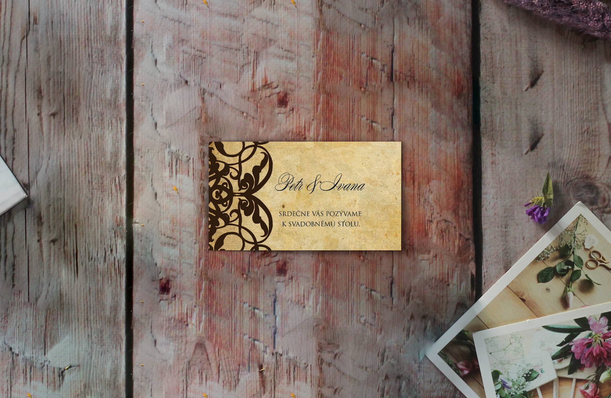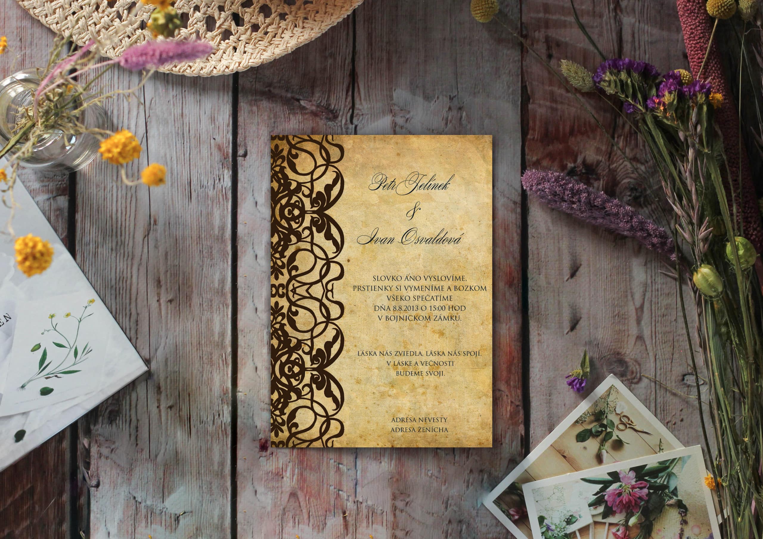 Jemné svadobné oznámenie pre zaľúbenú nevestu so zmyslom pre nostalgiu. Svadobná grafika priťahuje najmä neprehliadnuteľným hnedým ornamentom a podkladom s imidžom zostarnutého papiera.Svadobné oznámenie formát A6, pozvánku máte v tom istom štýle, ako aj všetky ďalšie tlačoviny. Tlačené na 250g papieri. Potlač je jednostranná, ale je možné potlačiť aj zadnú stranu. Vieme zmeniť farby aj formát na požiadanie.