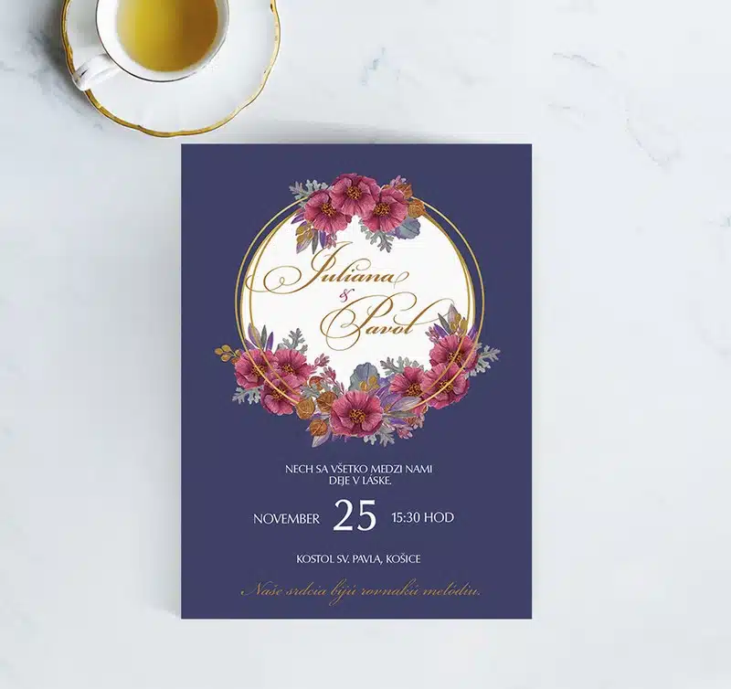 Výrazná teplá fialová farba v kontraste so zlatou a bordovou, osloví oko a zaujme príjemcu. Svadobné oznámenie je doplnené súčasnou elegantnou typografiou, ako aj spôsobom umiestnenia textu a dôležitých informácií. Jednoducho si ho zamilujete.Svadobné oznámenie formát A6, pozvánku máte v tom istom štýle, ako aj všetky ďalšie tlačoviny. Tlačené na 250g papieri. Potlač je jednostranná, ale je možné potlačiť aj zadnú stranu. Vieme zmeniť farby aj formát na požiadanie.