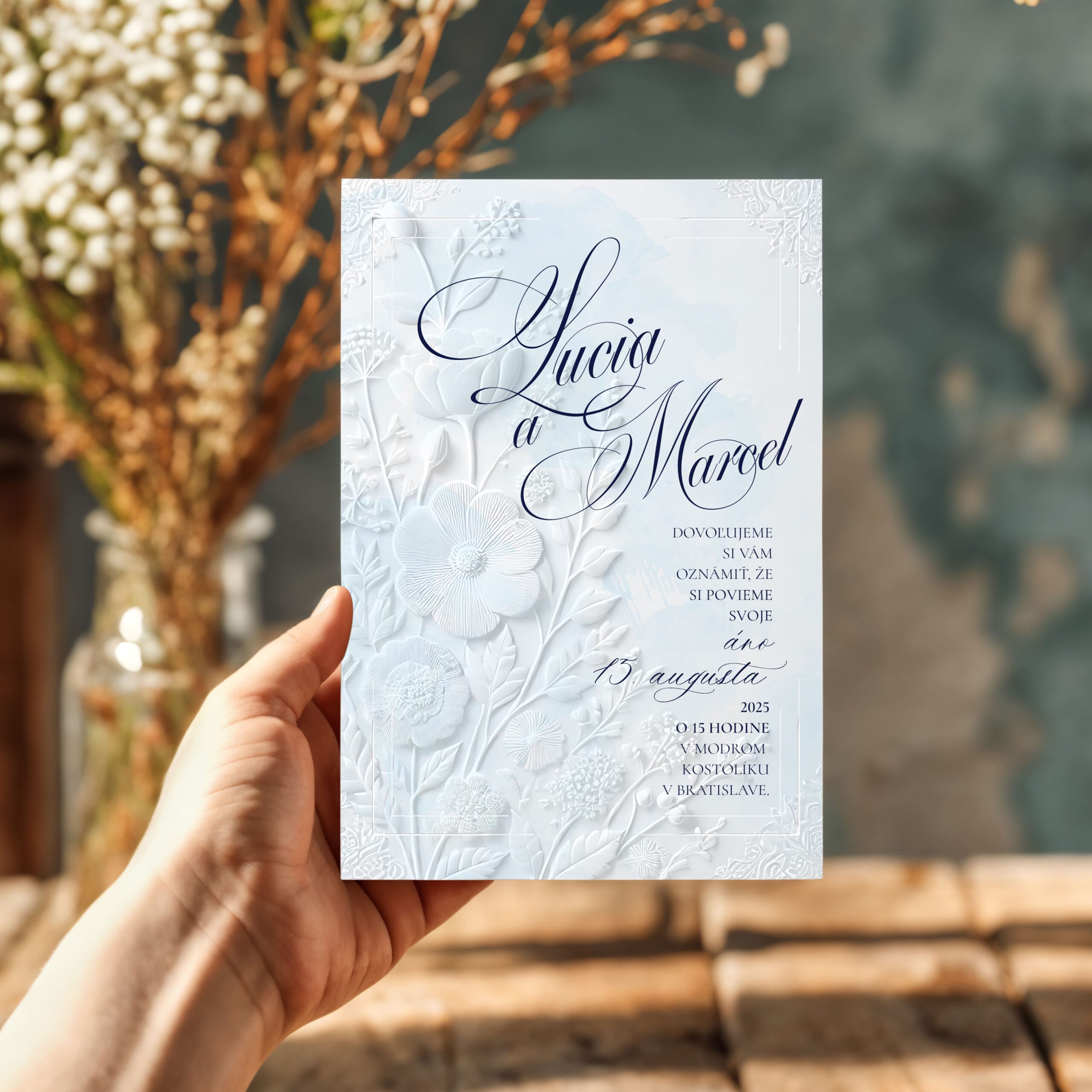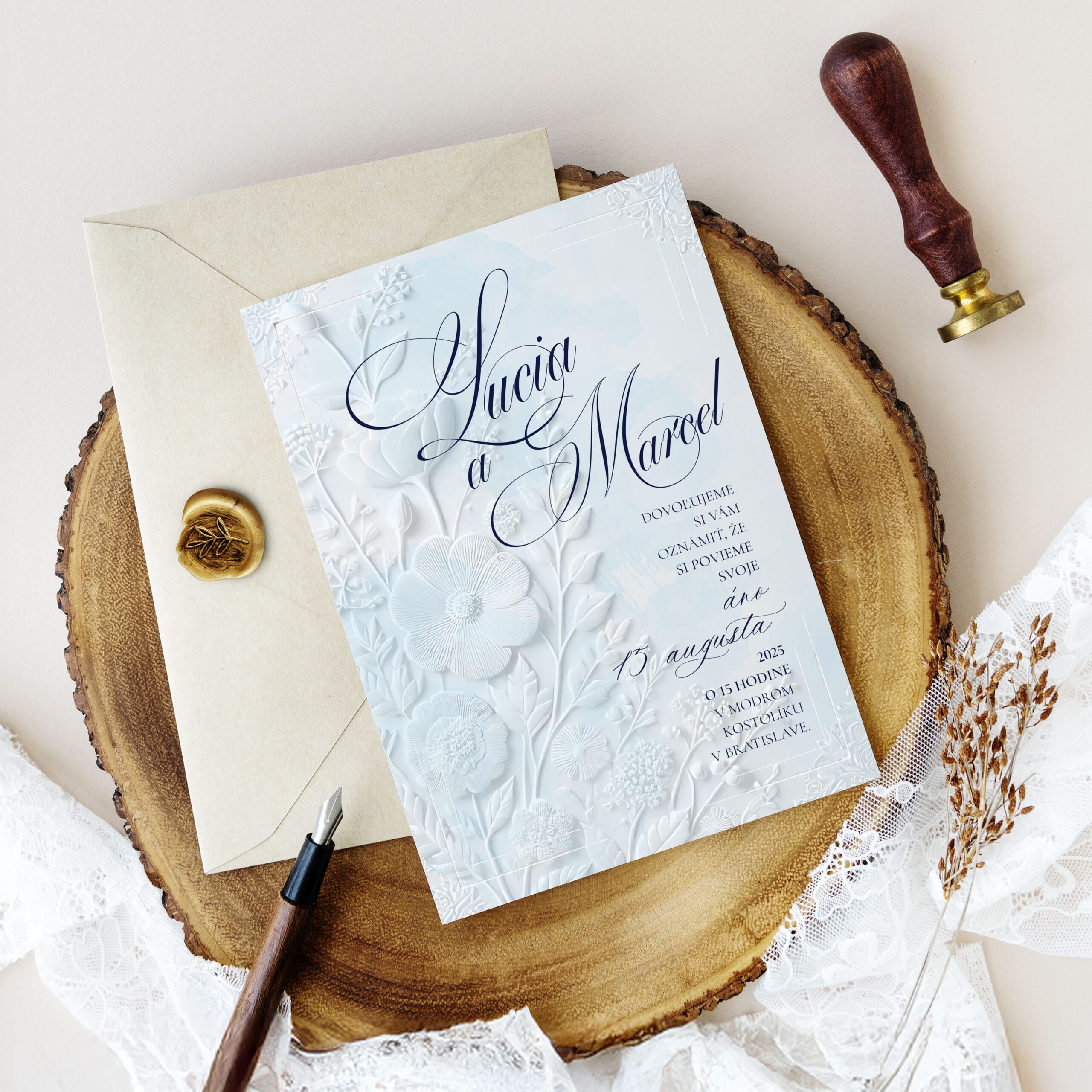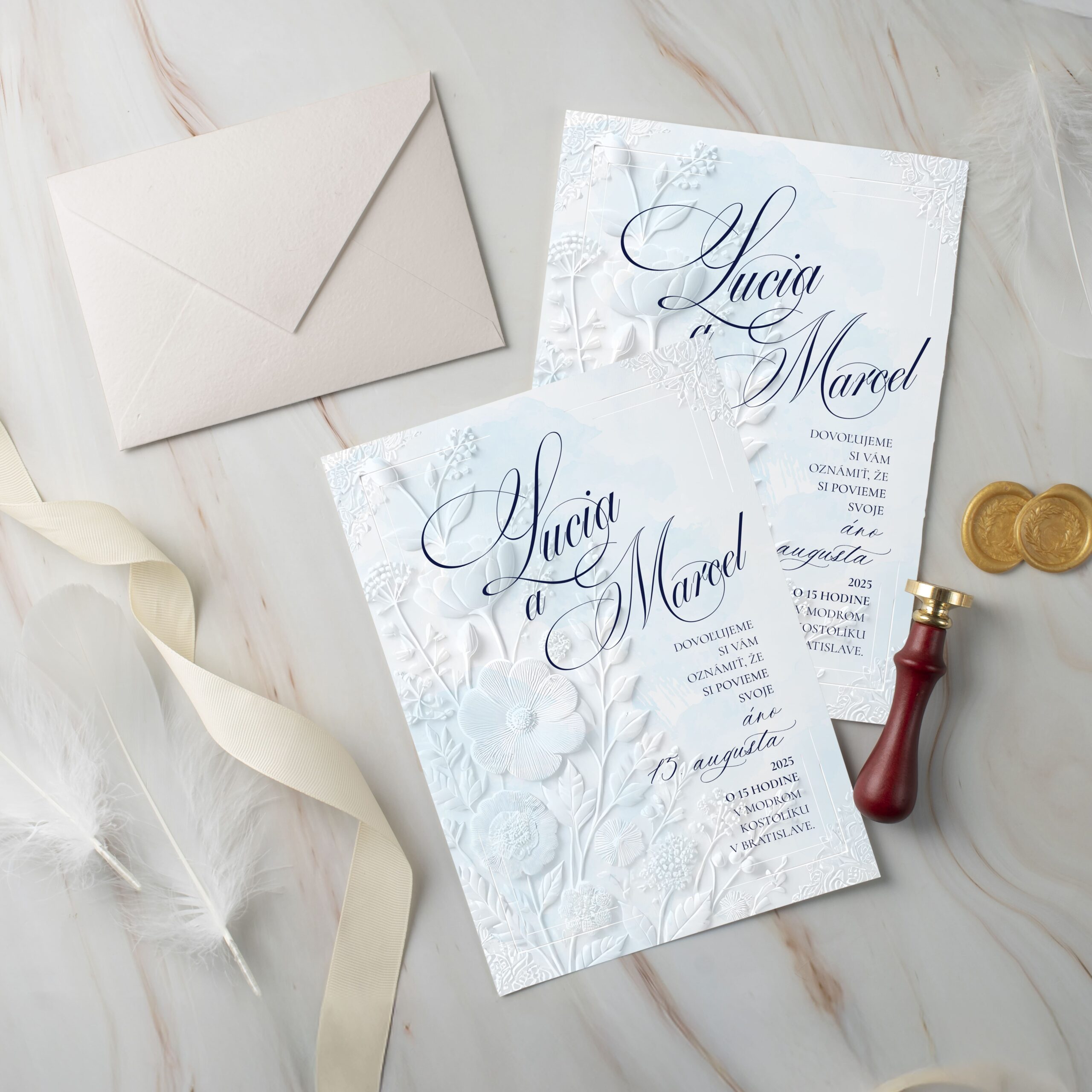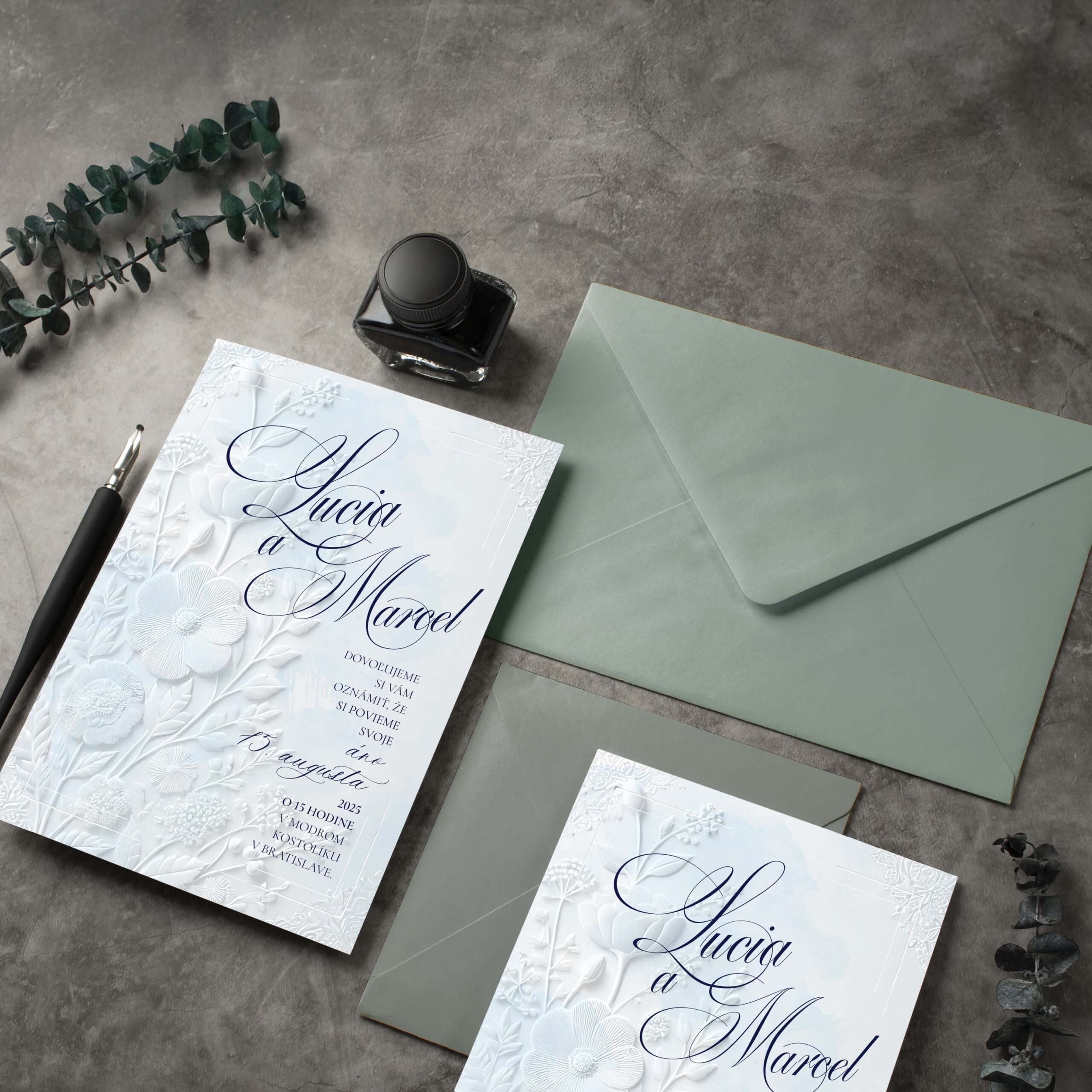 Pošlite toto milé a jemné svadobné oznámenie, nakombinované s jemnými tónmi modrej a bielej farby. Svadobné oznámenie formát 10×14 cm, pozvánku máte v tom istom štýle, ako aj všetky ďalšie tlačoviny. Tlačené na papieri. Vieme zmeniť farby aj formát na požiadanie.