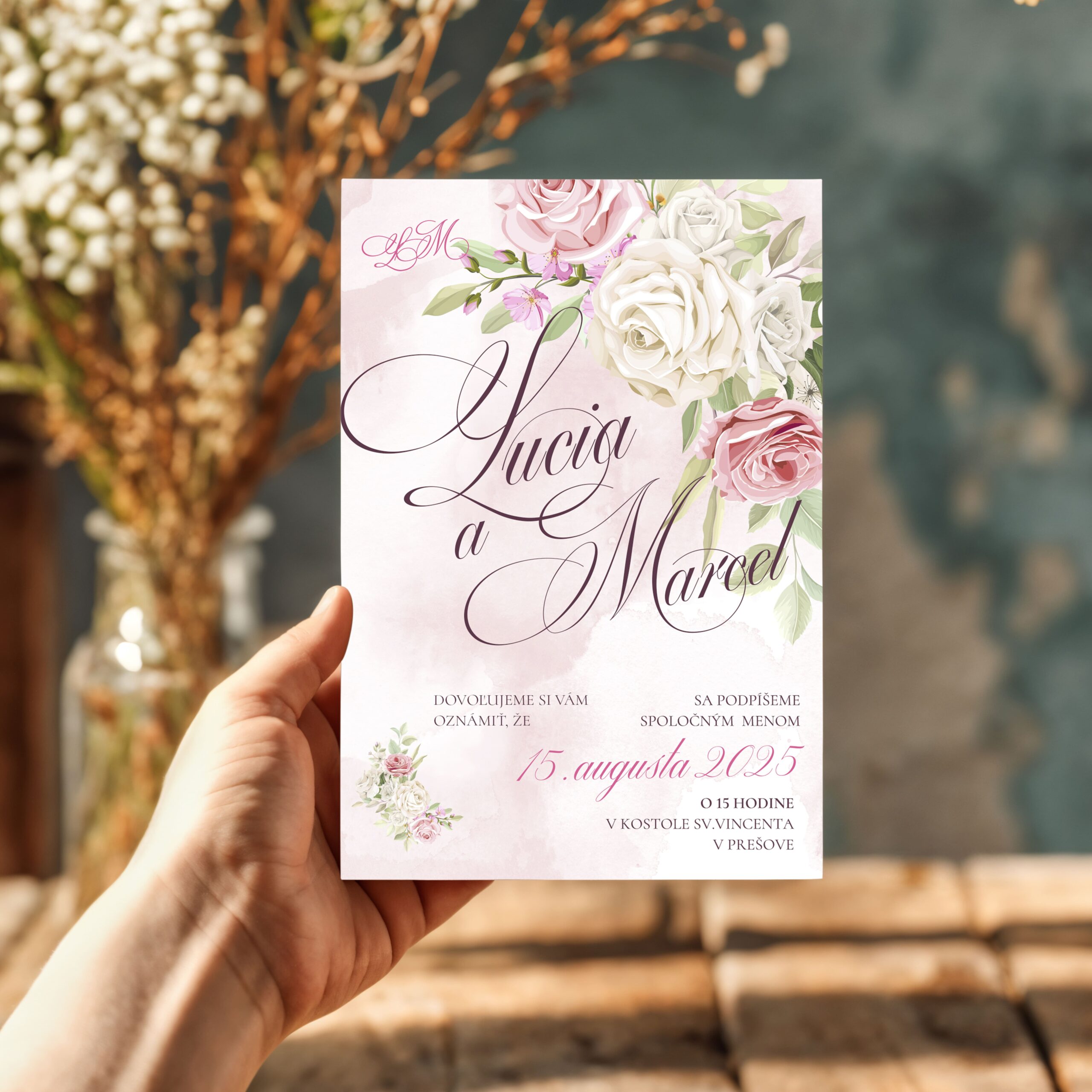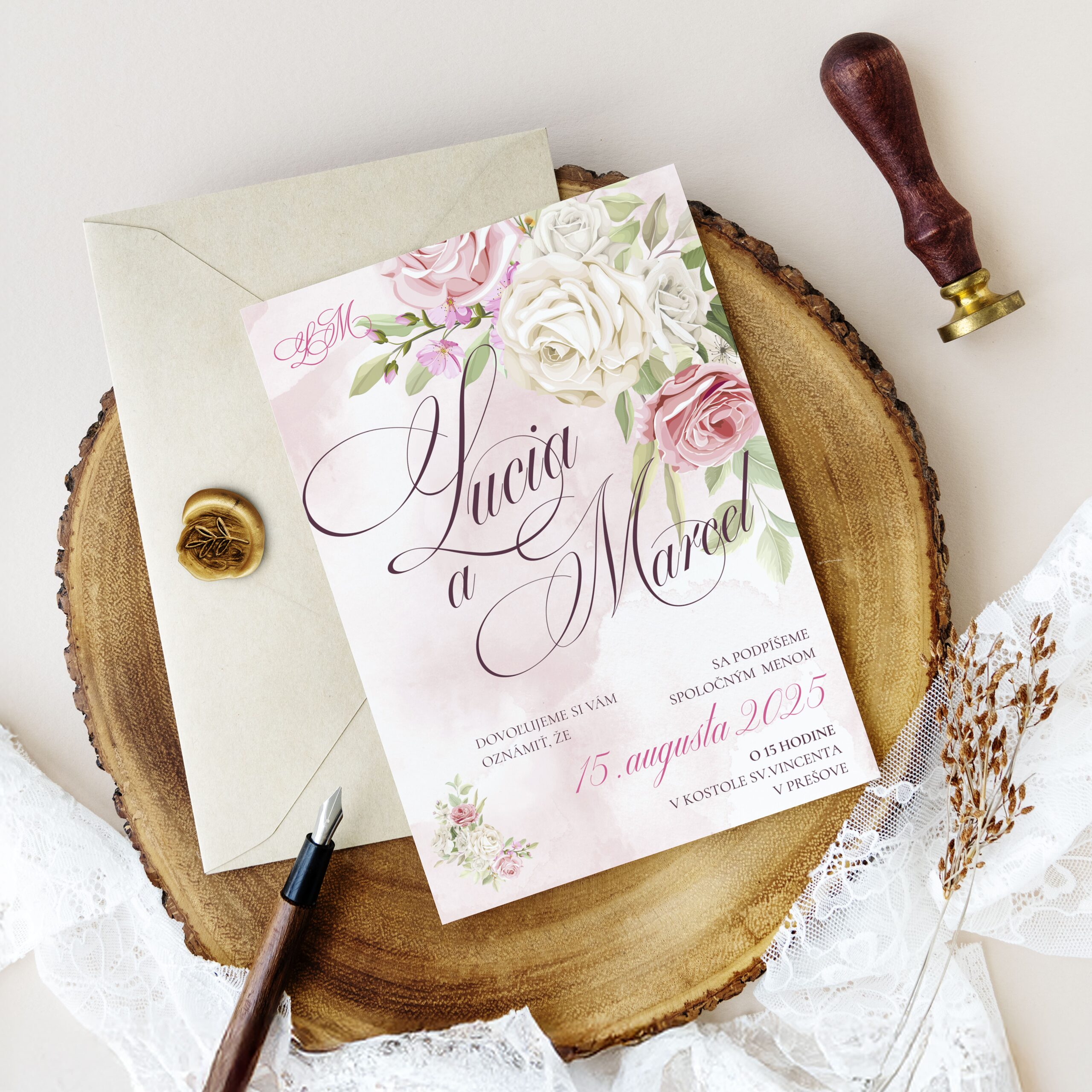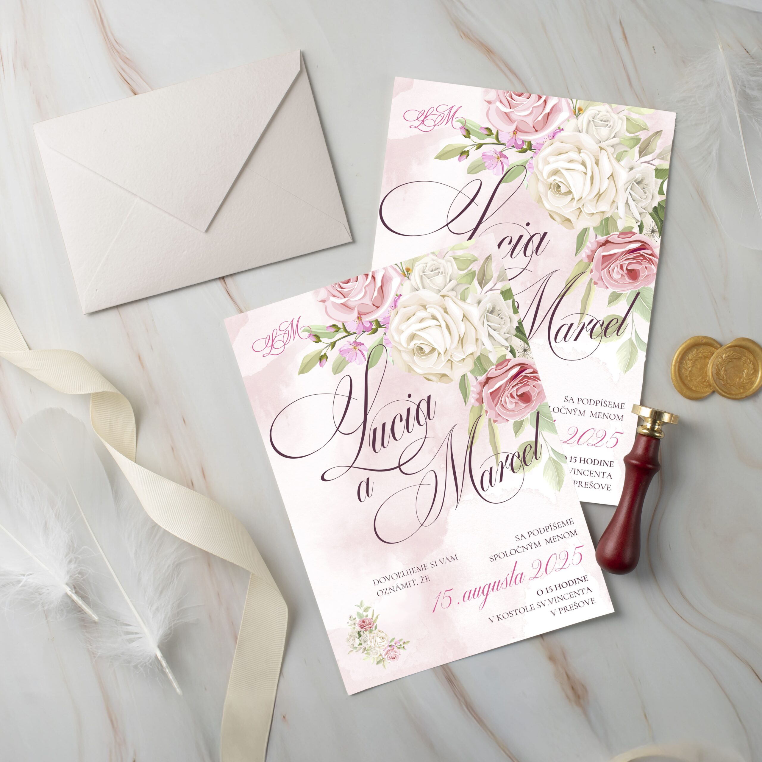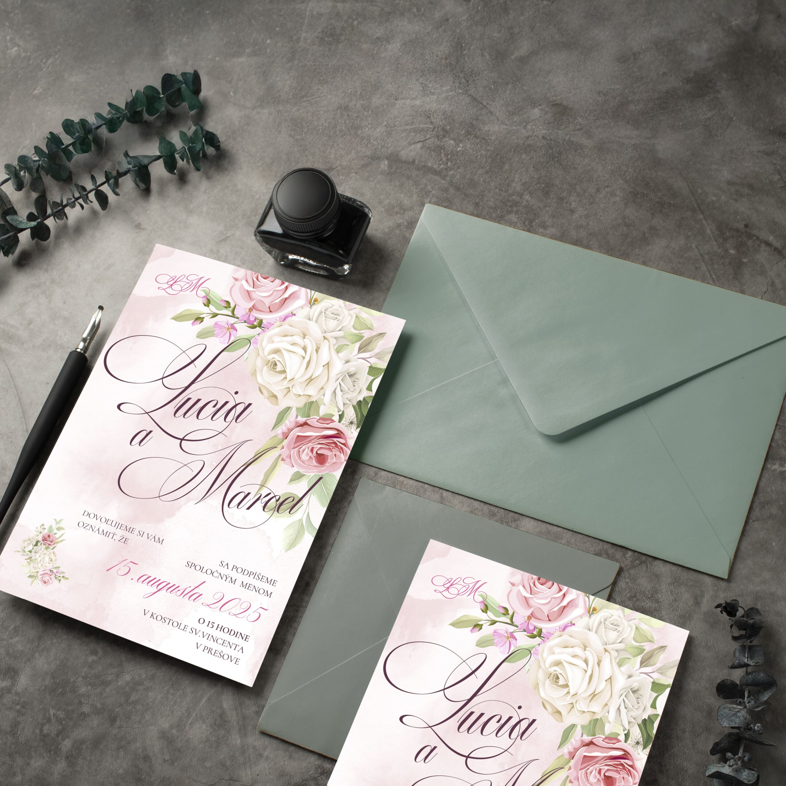 Pošlite toto milé a jemné svadobné oznámenie, nakombinované s jemnými tónmi ružovej a zelenej farby. Svadobné oznámenie formát 10×14 cm, pozvánku máte v tom istom štýle, ako aj všetky ďalšie tlačoviny. Tlačené na papieri. Vieme zmeniť farby aj formát na požiadanie.