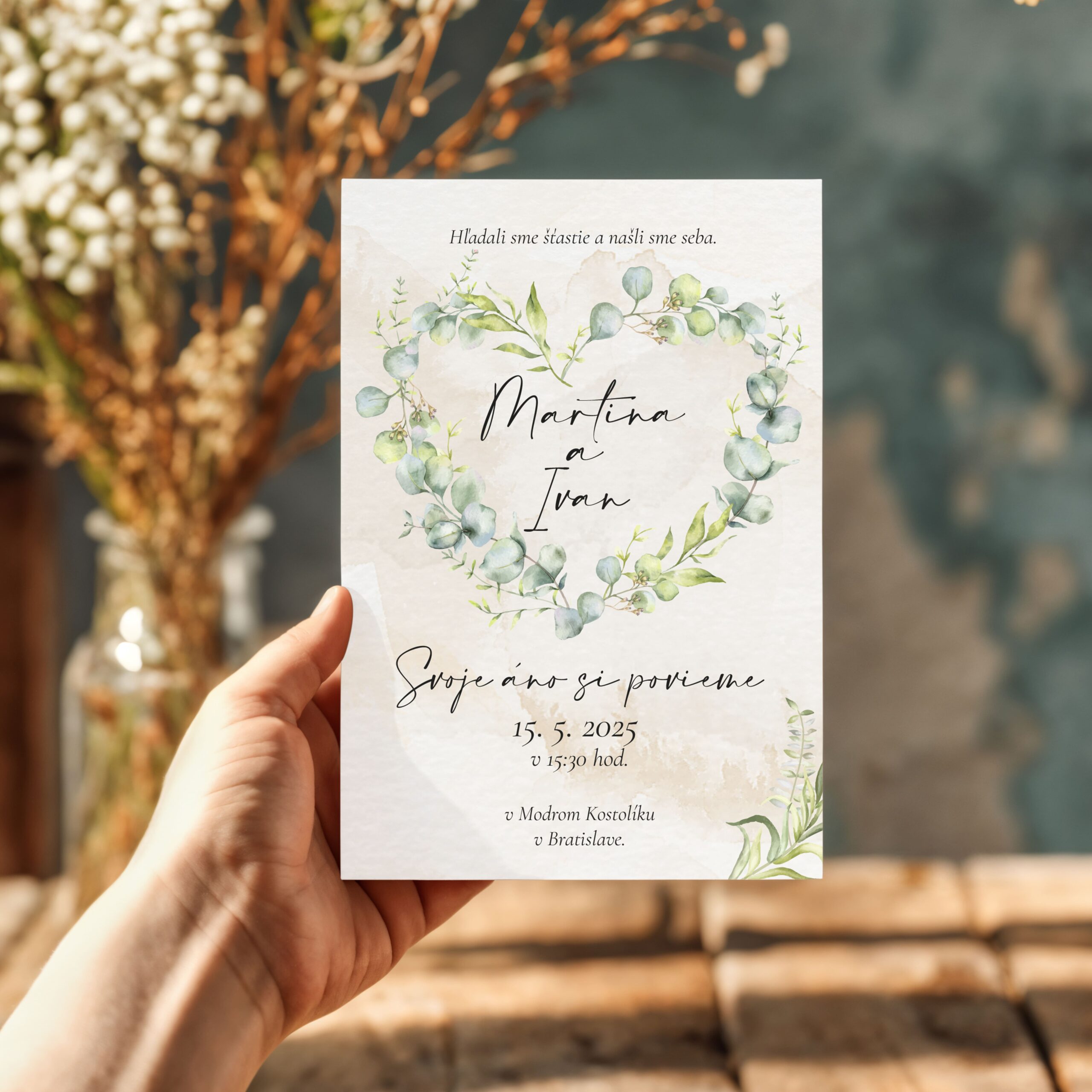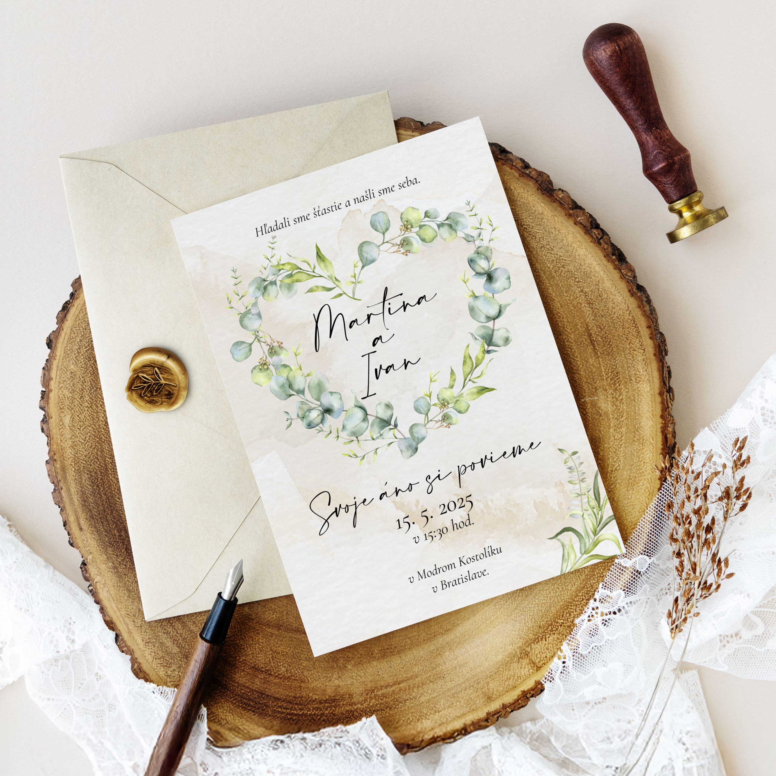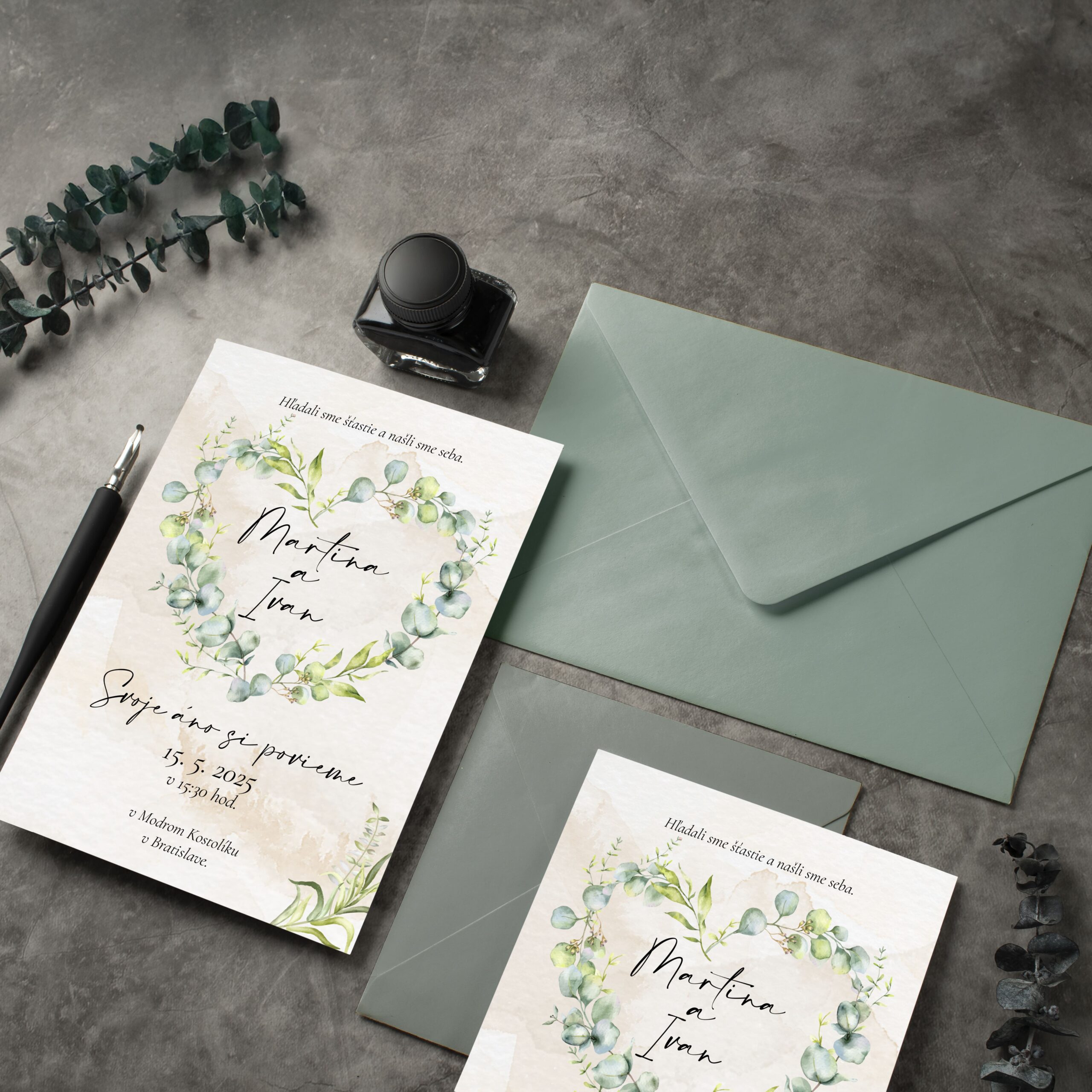 Pošlite toto milé a jemné svadobné oznámenie, nakombinované s jemnými tónmi zelenej farby. Svadobné oznámenie formát 10×14 cm, pozvánku máte v tom istom štýle, ako aj všetky ďalšie tlačoviny. Tlačené na papieri. Vieme zmeniť farby aj formát na požiadanie.