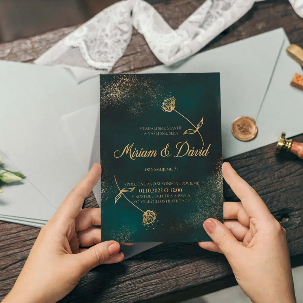Luxusné svadobné oznámenie so simuláciou zlatého písma. Najnovší dizajn na základe súčasných moderných trendov v oblasti svadobných oznámení.
