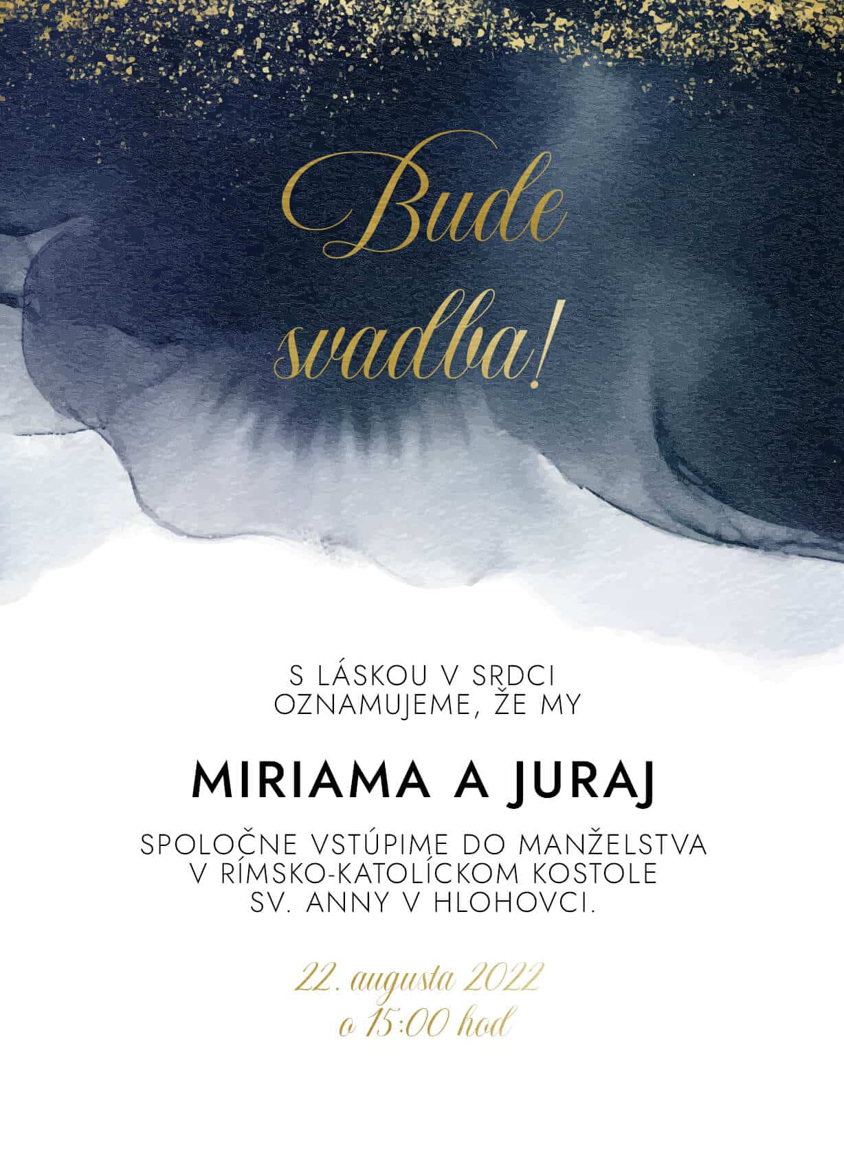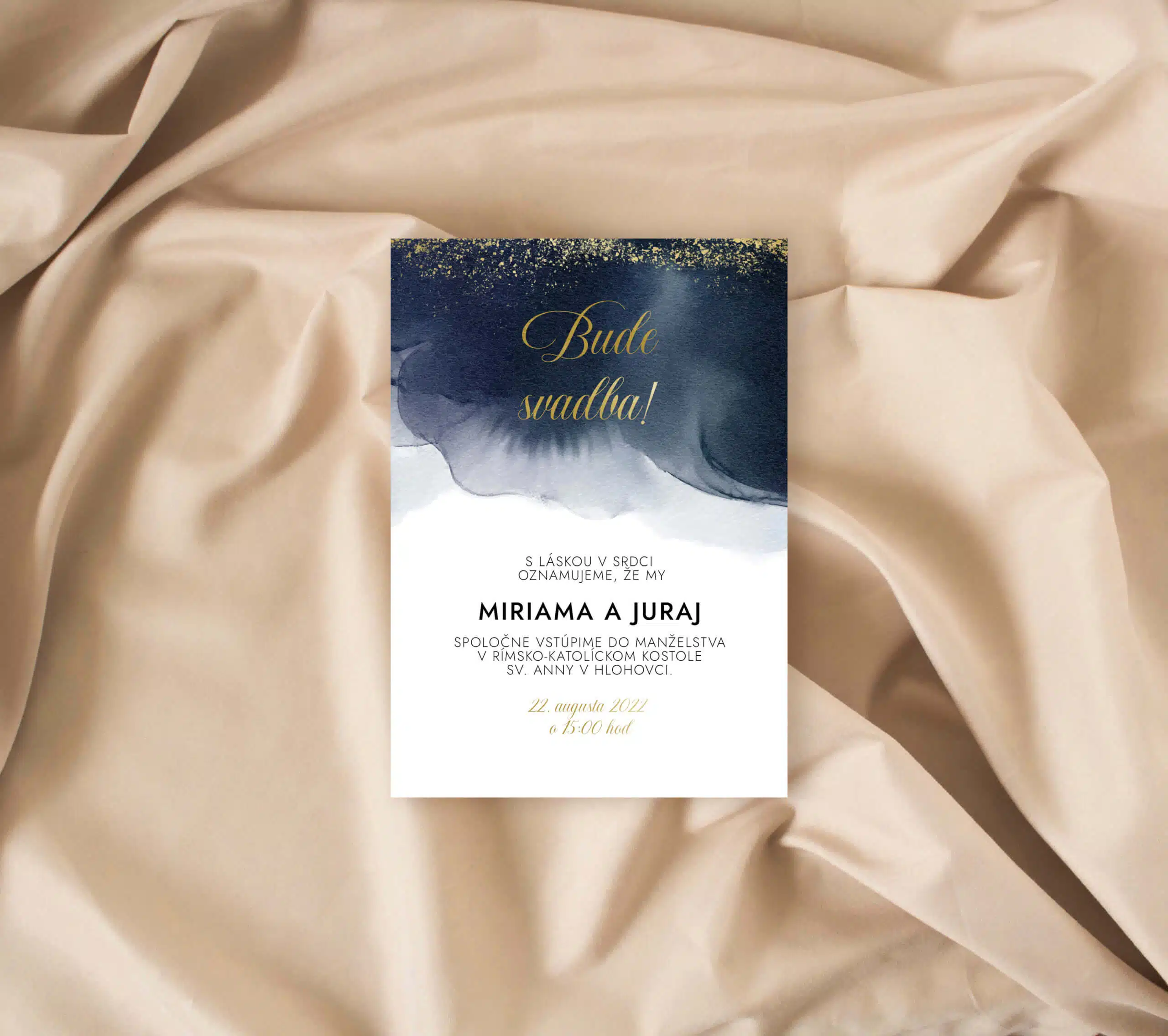 Podmanivé svadobné oznámenie v námorníckej modrej. Luxusnosť prevedenia podčiarkuje zlaté písmo a okrasný font. Celé svadobné oznámenie pritiahne pozornosť a vaši hostia tak dostanú informáciu o vašom veľkom dni skutočne veľkolepo.