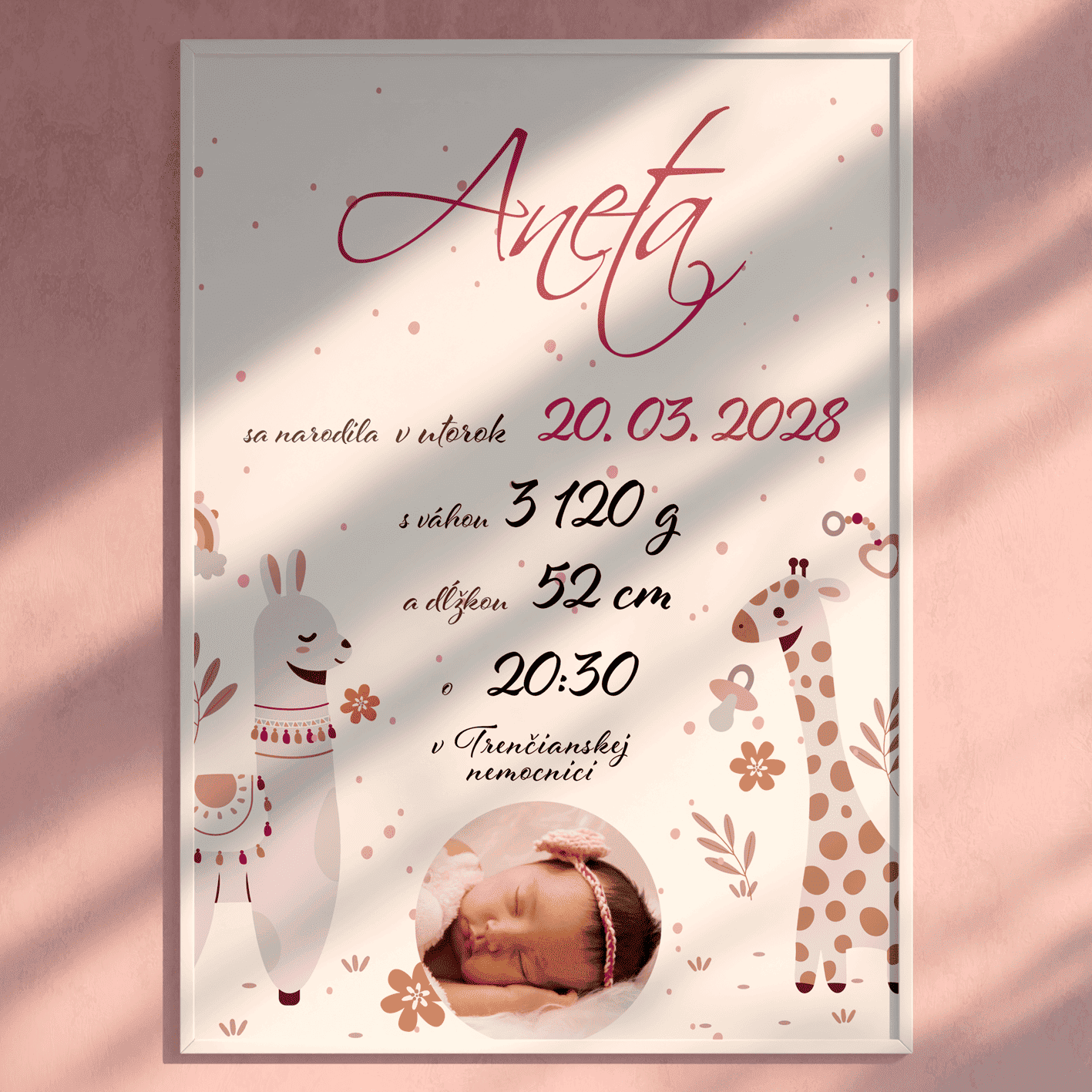 Narodenie dieťaťa je okamih, na ktorý nezabudnete celý život. Aby ste mali tieto vzácne spomienky uchované navždy, pripravíme pre vás originálnu pamätnú tabuľku o narodení. Obsahuje všetky údaje o vašom bábätku a vďaka krásnej grafike sa stane jedinečnou dekoráciou aj darčekom.