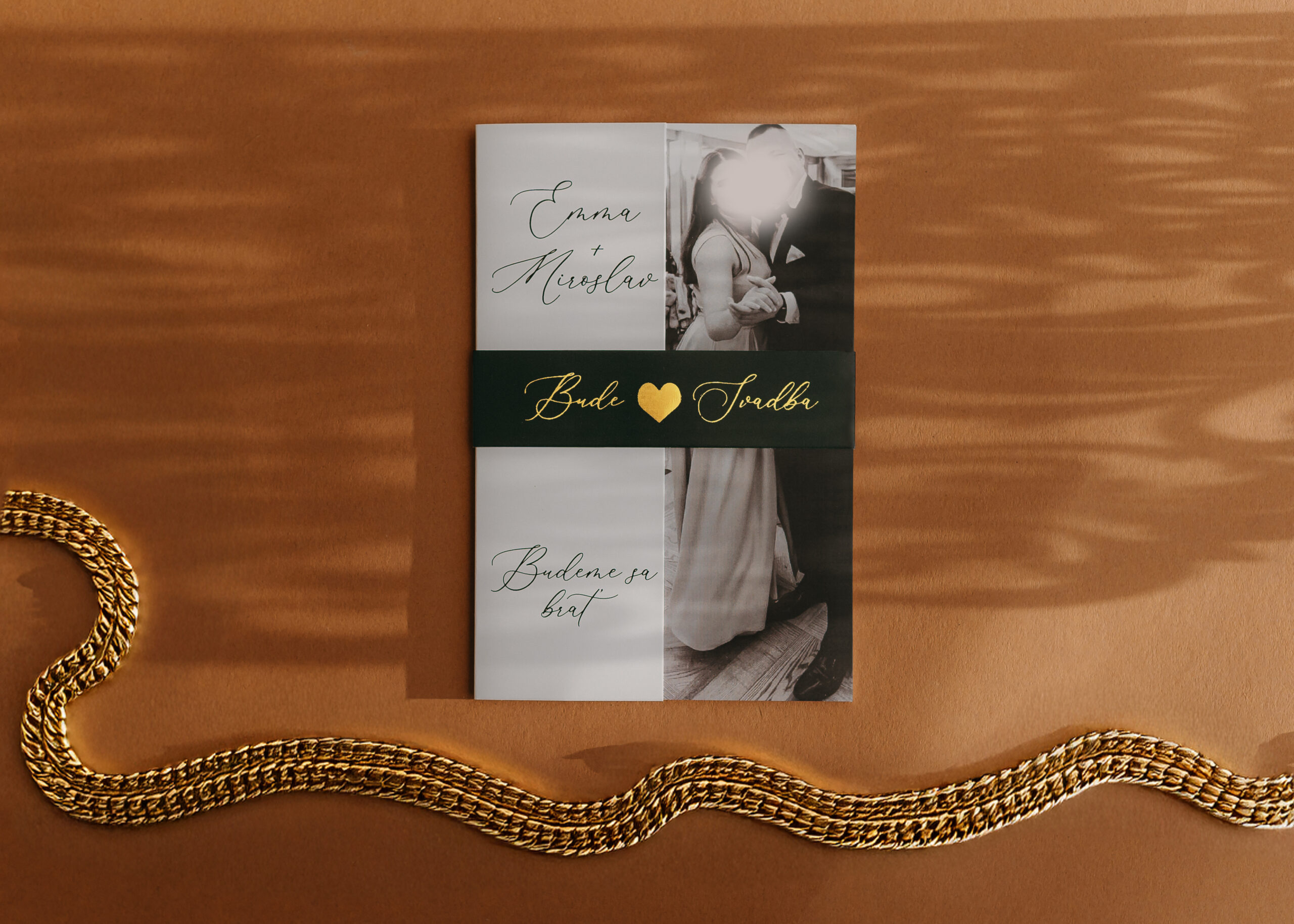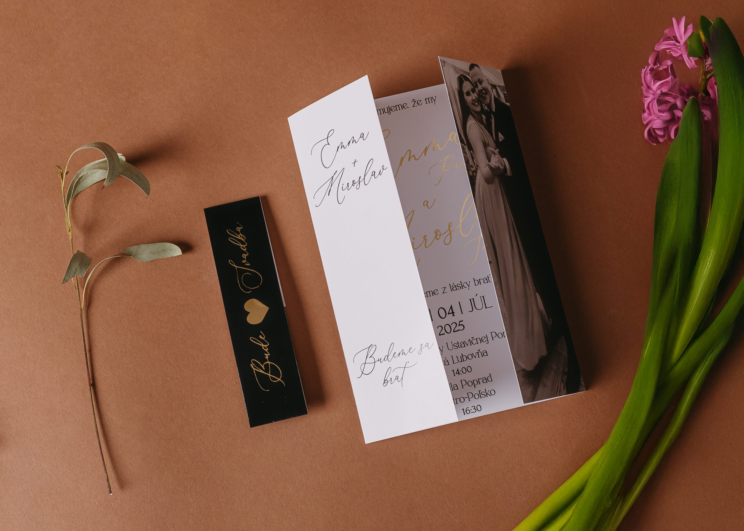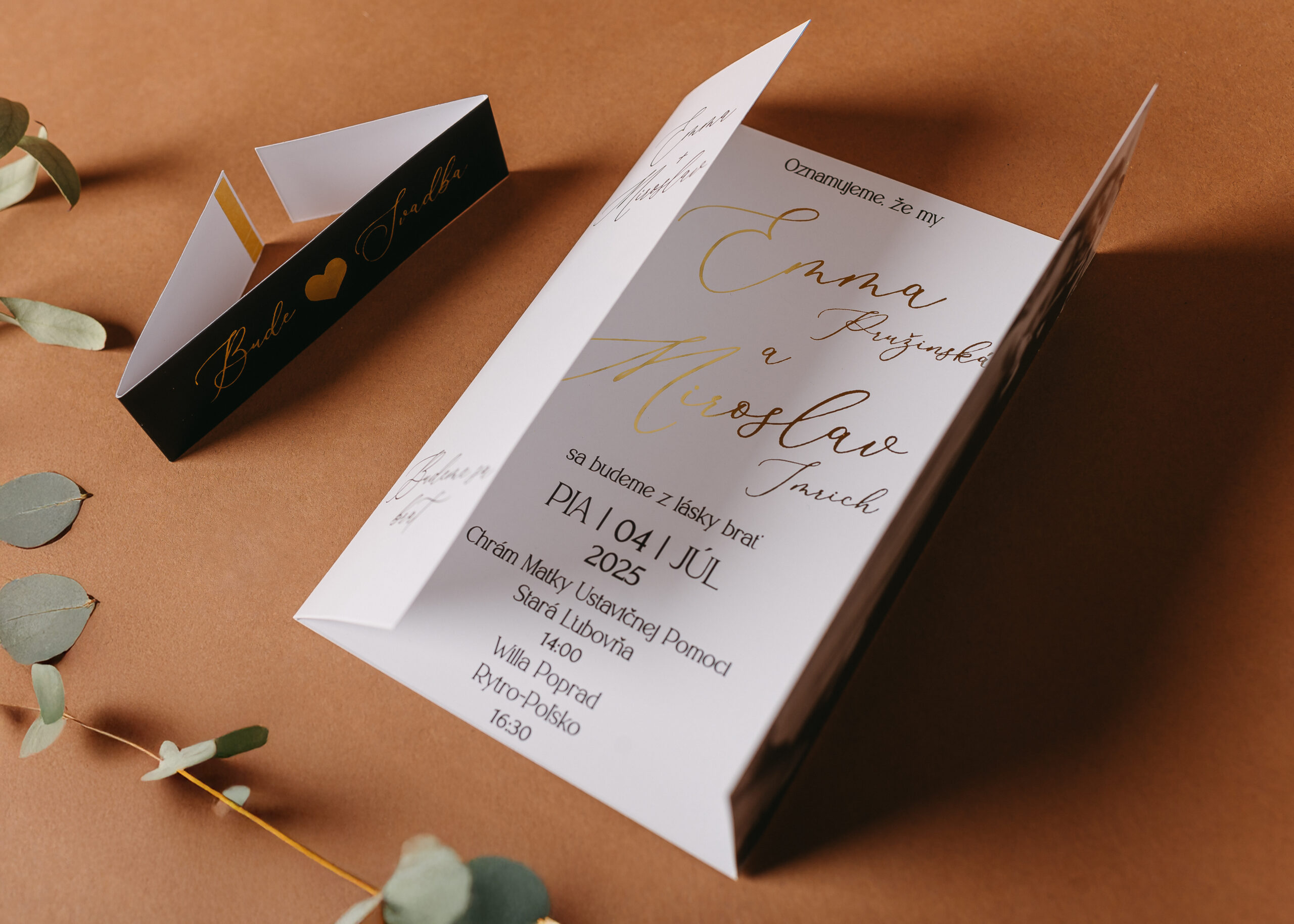 Rozkladacie svadobné oznámenie s vašou fotografiou, zlatou metalickou potlačou na vašich menách a štýlovým pásikom s metalickou potlačou sa textom “Bude svadba“. Krásne a nezabudnuteľné oznámenie, ktoré ponúka dostatok priestoru na vašu fotografiu, text oznámenia a prípadné ďalšie inštrukcie ohľadom vašej svadby. Metalickú potlač vieme vyhotoviť vo farbe GOLD, SILVER, ROSEGOLD.