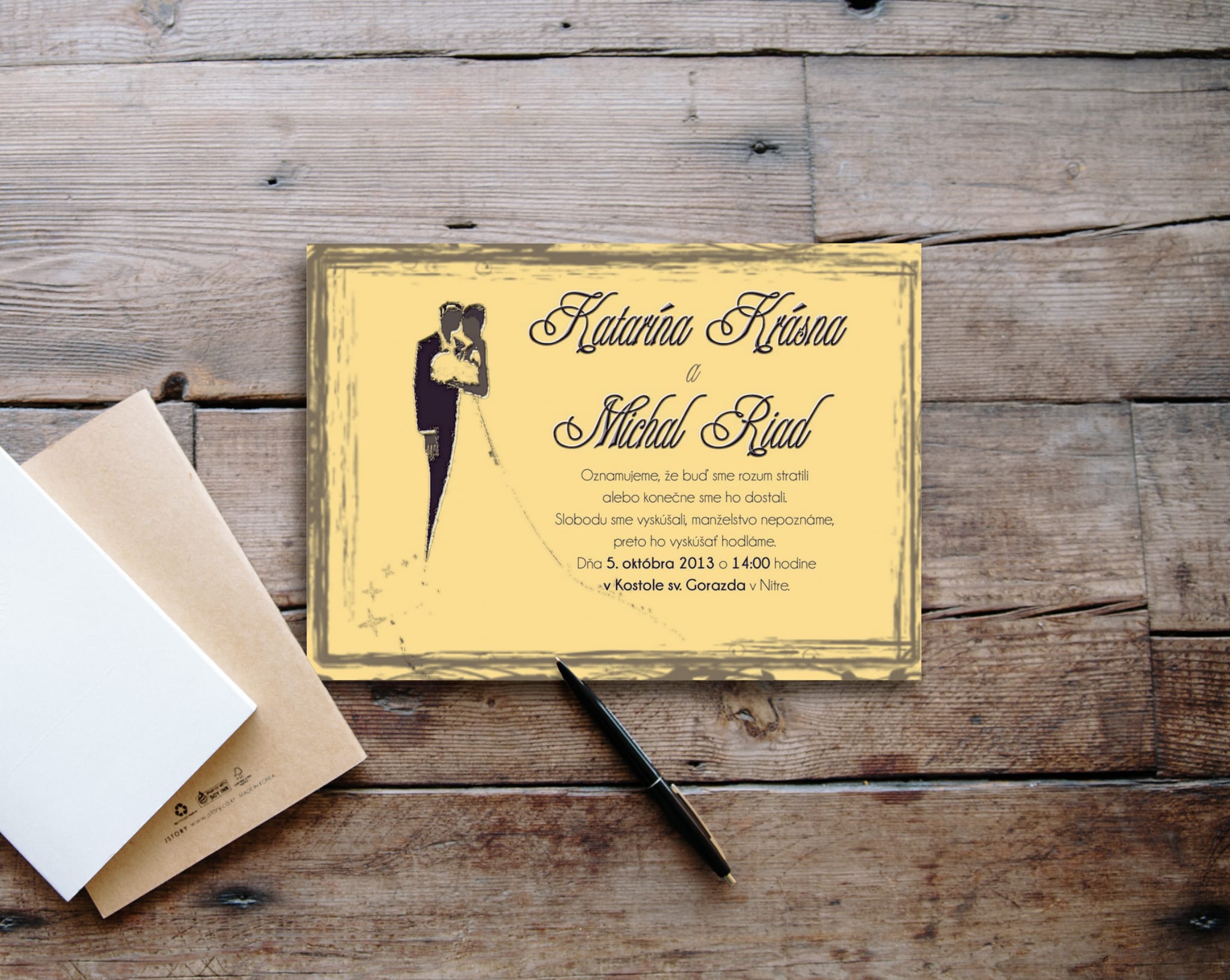 Klasické a zároveň podmanivé svadobné oznámenie na jemnom smotanovom podklade so sivým lemovaním. Ústredný motív tvorí nevesta a ženích.Svadobné oznámenie formát A6, pozvánku máte v tom istom štýle, ako aj všetky ďalšie tlačoviny. Tlačené na 250g papieri. Potlač je jednostranná, ale je možné potlačiť aj zadnú stranu. Vieme zmeniť farby aj formát na požiadanie.