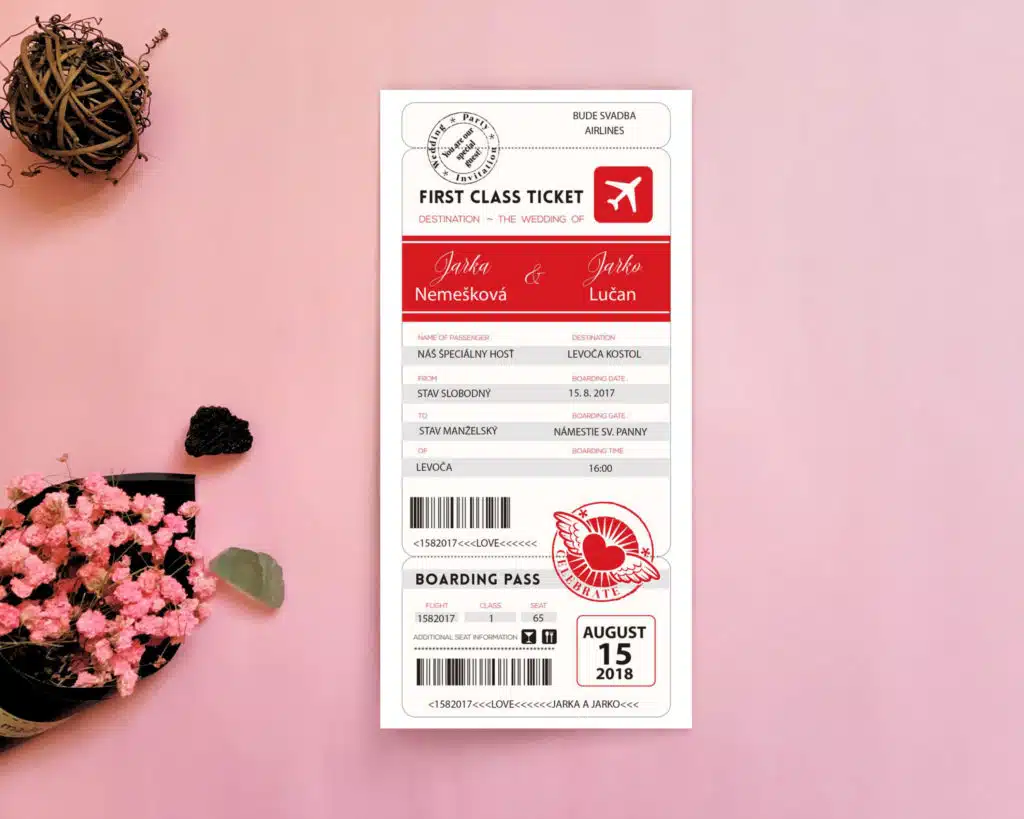 Nápadité svadobné oznámenie s originálnym imidžom letenky. Vhodné pre budúcich manželov, ktorí sa neboja lietať vysoko v oblakoch.Svadobné oznámenie formát A6, pozvánku máte v tom istom štýle, ako aj všetky ďalšie tlačoviny. Tlačené na 250g papieri. Potlač je jednostranná, ale je možné potlačiť aj zadnú stranu. Vieme zmeniť farby aj formát na požiadanie.
