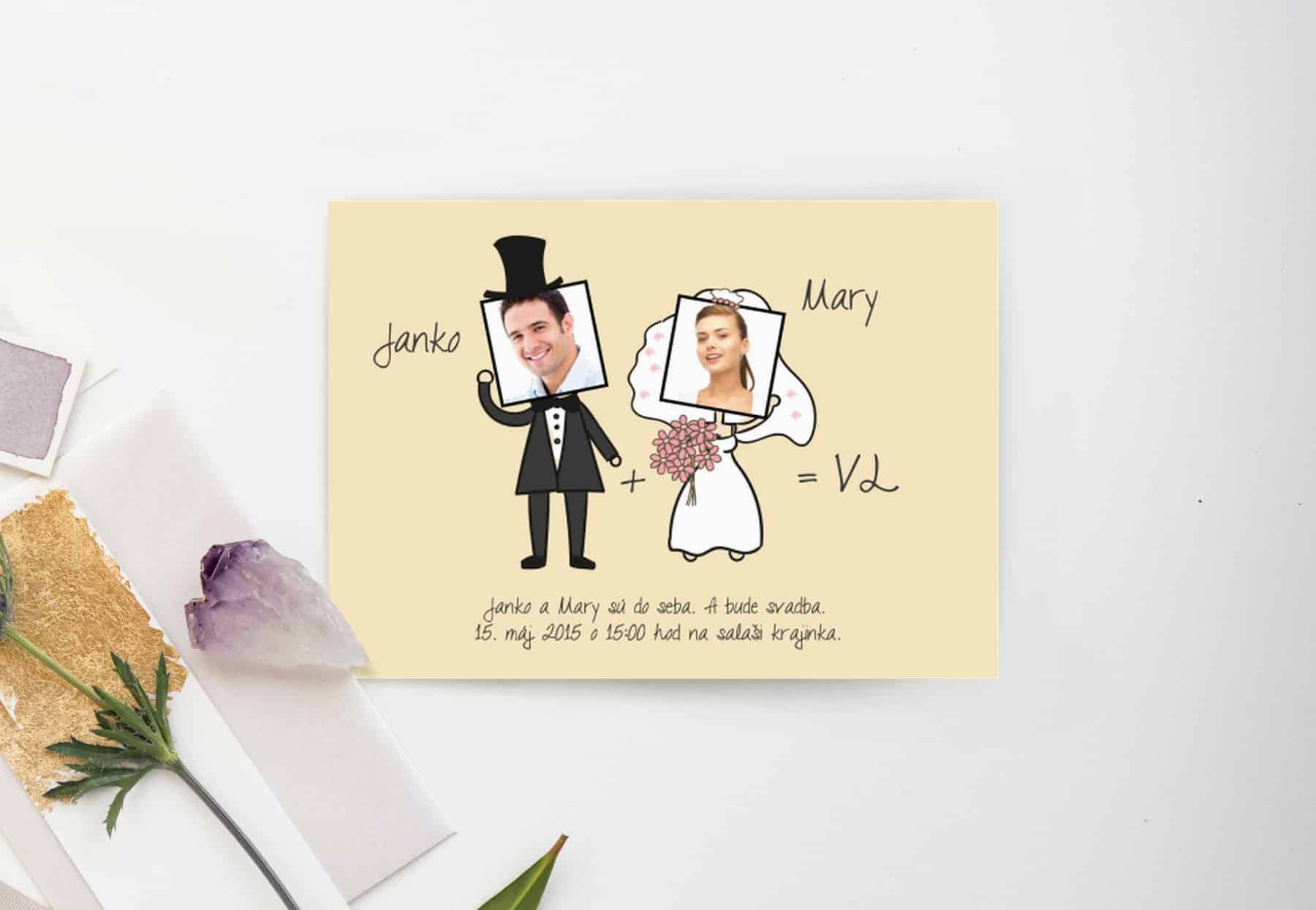 Vtipné svadobné oznámenie, ktoré Vás tak trochu prenesie do školských čias. Nevesta a ženích dosadení do príkladu s jasným výsledkom – veľká láska. Svadobná grafika doplnená o fotografie budúcich manželov.Svadobné oznámenie formát A6, pozvánku máte v tom istom štýle, ako aj všetky ďalšie tlačoviny. Tlačené na 250g papieri. Potlač je jednostranná, ale je možné potlačiť aj zadnú stranu. Vieme zmeniť farby aj formát na požiadanie.