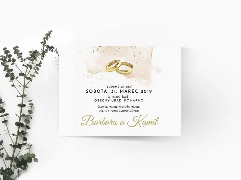Jednoduché svadobné oznámenie so štýlovými zlatými obrúčkami na jemne zlatom pozadí. Oznámeniu dominujú krstné mená a dátum svadby.Svadobné oznámenie formát A6, pozvánku máte v tom istom štýle, ako aj všetky ďalšie tlačoviny. Tlačené na 250g papieri. Potlač je jednostranná, ale je možné potlačiť aj zadnú stranu. Vieme zmeniť farby aj formát na požiadanie.