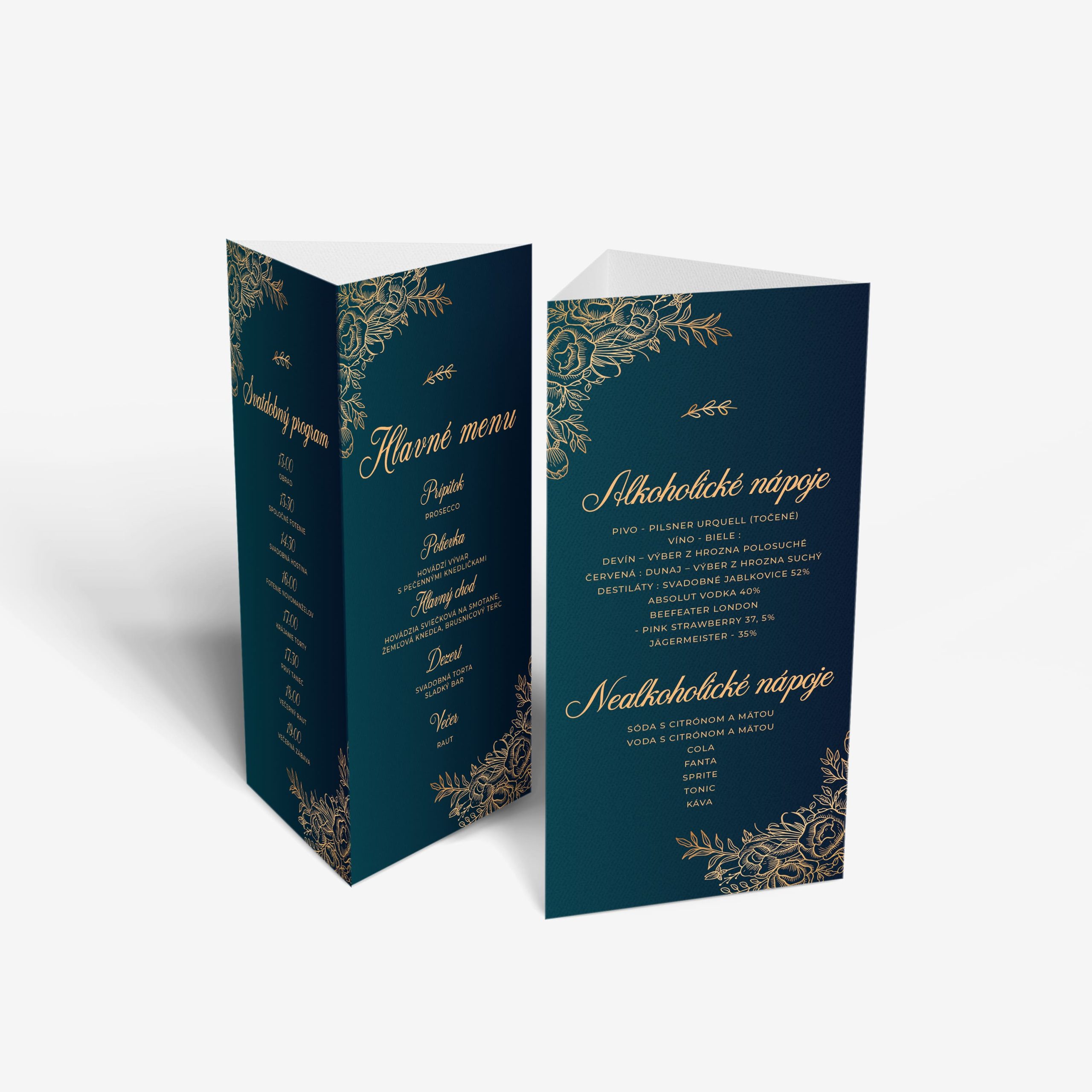 Svadobné menu v tvare trojhranu je krásny detail, ktorý z tvojho svadobného stola spraví niečo výnimočné. Formát A4 zložený na tretiny a zlepený do stojana je ideálny pre svadobné menu – je stabilný, ľahko čitateľný z každej strany a dokonale ladí s dekoráciami aj s ostatnou svadobnou tlačovinou.