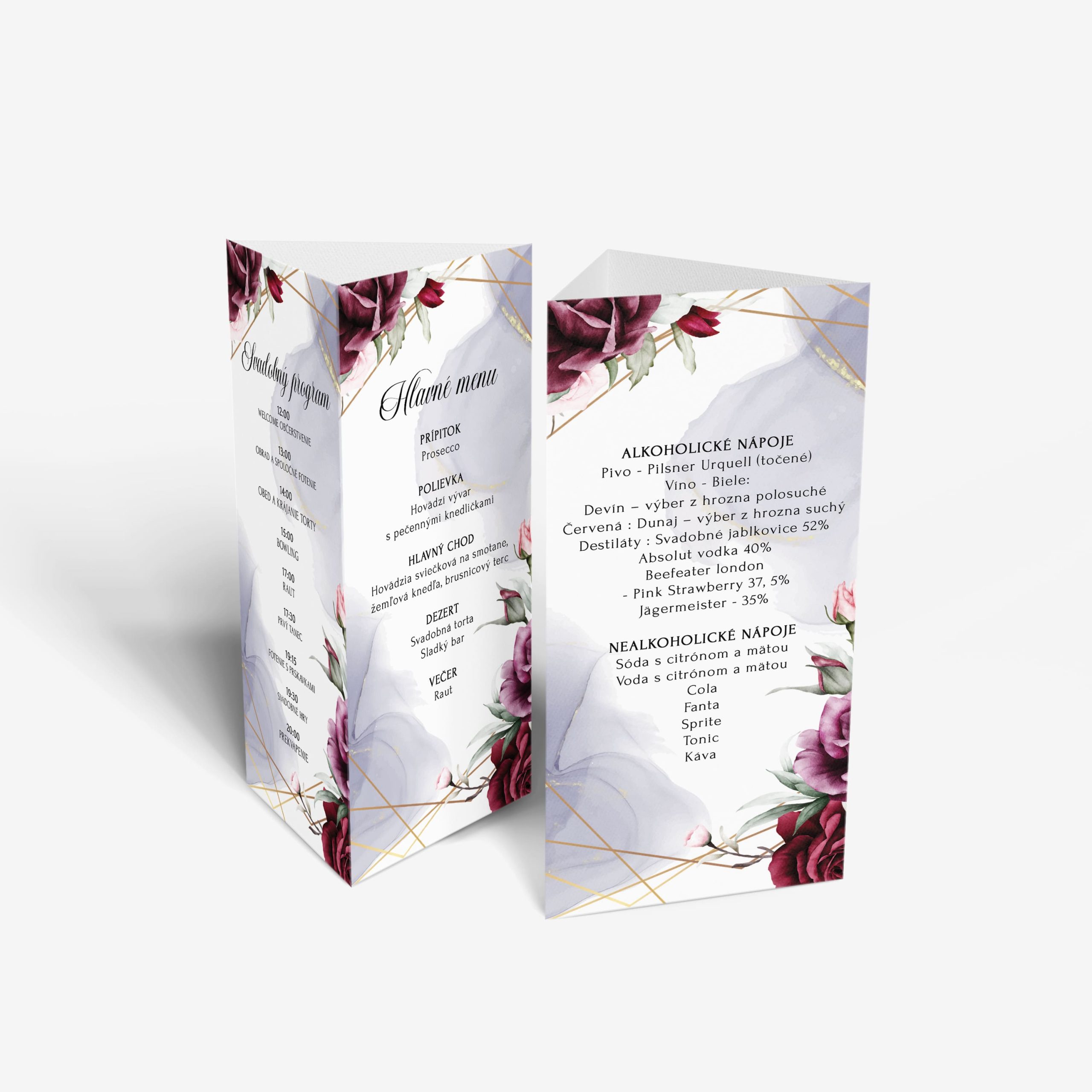 Svadobné menu v tvare trojhranu je krásny detail, ktorý z tvojho svadobného stola spraví niečo výnimočné. Formát A4 zložený na tretiny a zlepený do stojana je ideálny pre svadobné menu – je stabilný, ľahko čitateľný z každej strany a dokonale ladí s dekoráciami aj s ostatnou svadobnou tlačovinou.