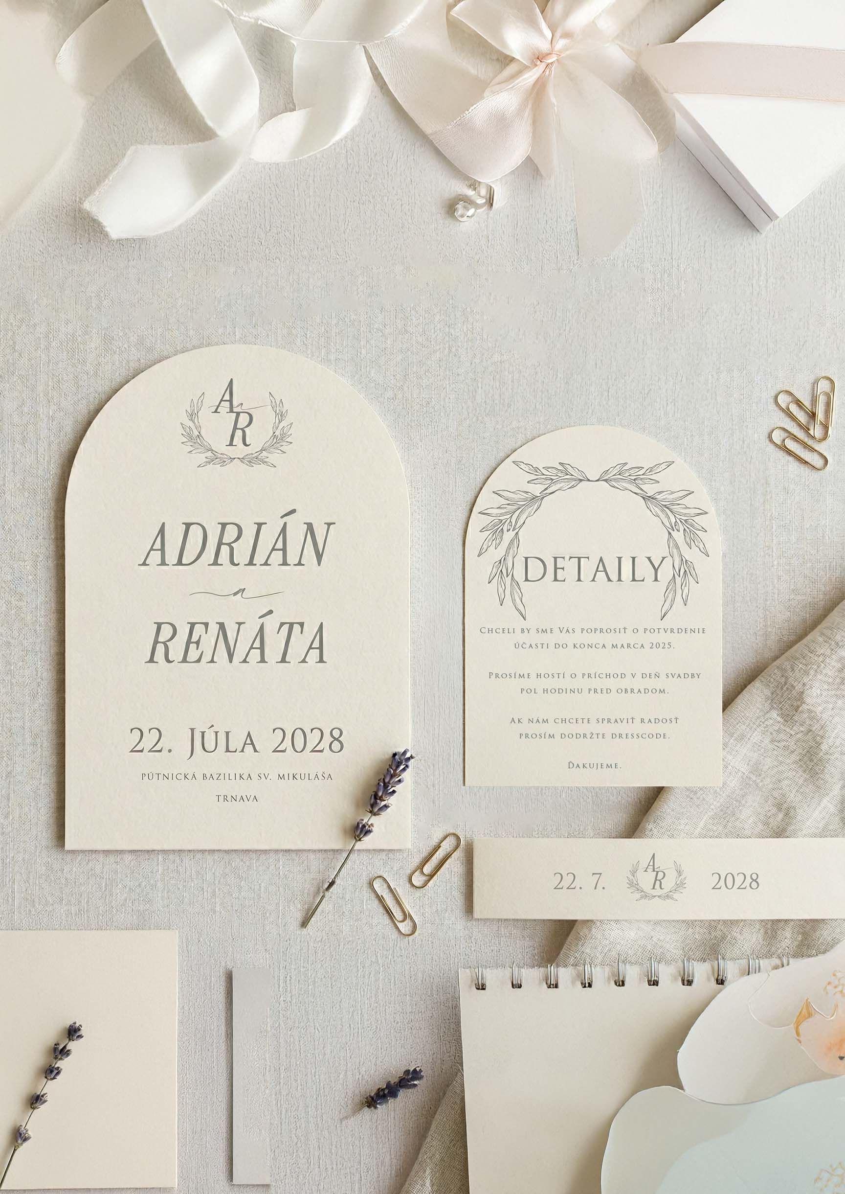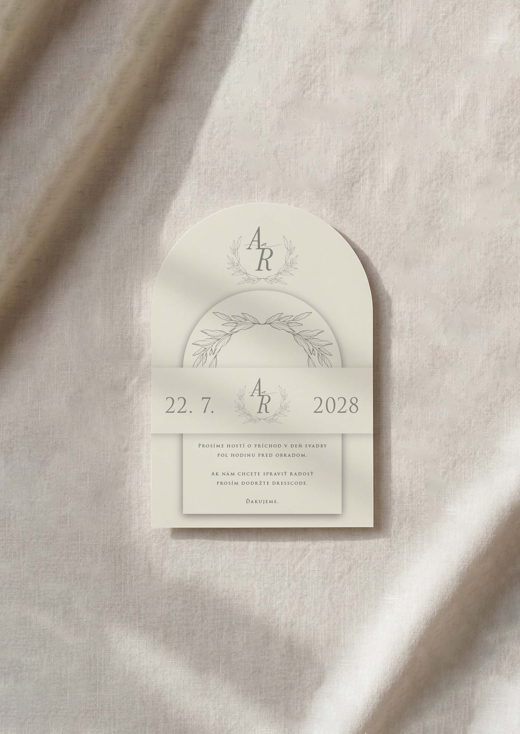 Toto polkruhové svadobné oznámenie je navrhnuté tak, aby vyvolalo emóciu ešte skôr, než si prečítajú text. Jemný oblúk, precízne spracovanie a premyslený dizajn vytvárajú luxusný a moderný dojem, ktorý si každý zapamätá.