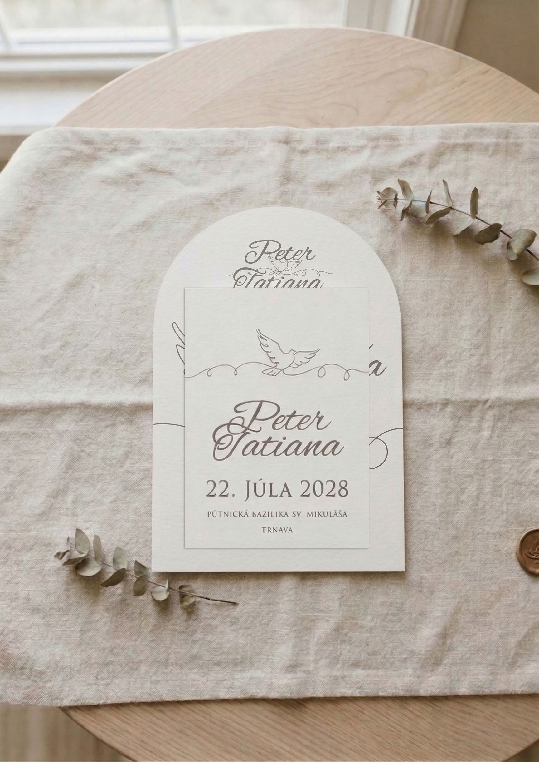 Toto polkruhové svadobné oznámenie je navrhnuté tak, aby vyvolalo emóciu ešte skôr, než si prečítajú text. Jemný oblúk, precízne spracovanie a premyslený dizajn vytvárajú luxusný a moderný dojem, ktorý si každý zapamätá.
