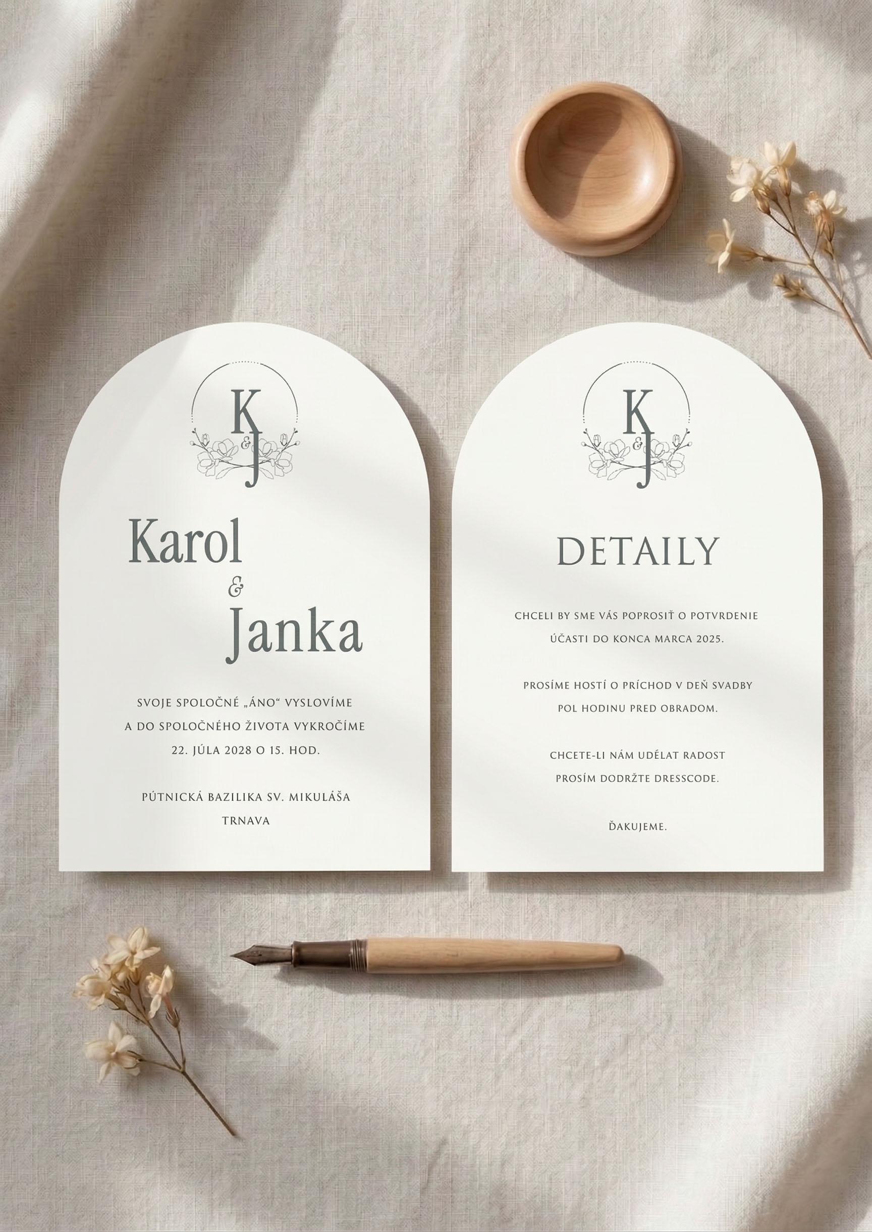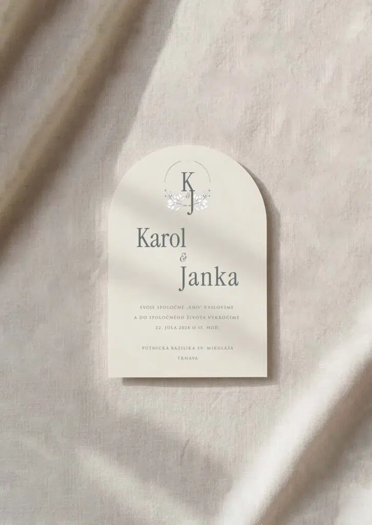 Toto polkruhové svadobné oznámenie je navrhnuté tak, aby vyvolalo emóciu ešte skôr, než si prečítajú text. Jemný oblúk, precízne spracovanie a premyslený dizajn vytvárajú luxusný a moderný dojem, ktorý si každý zapamätá.