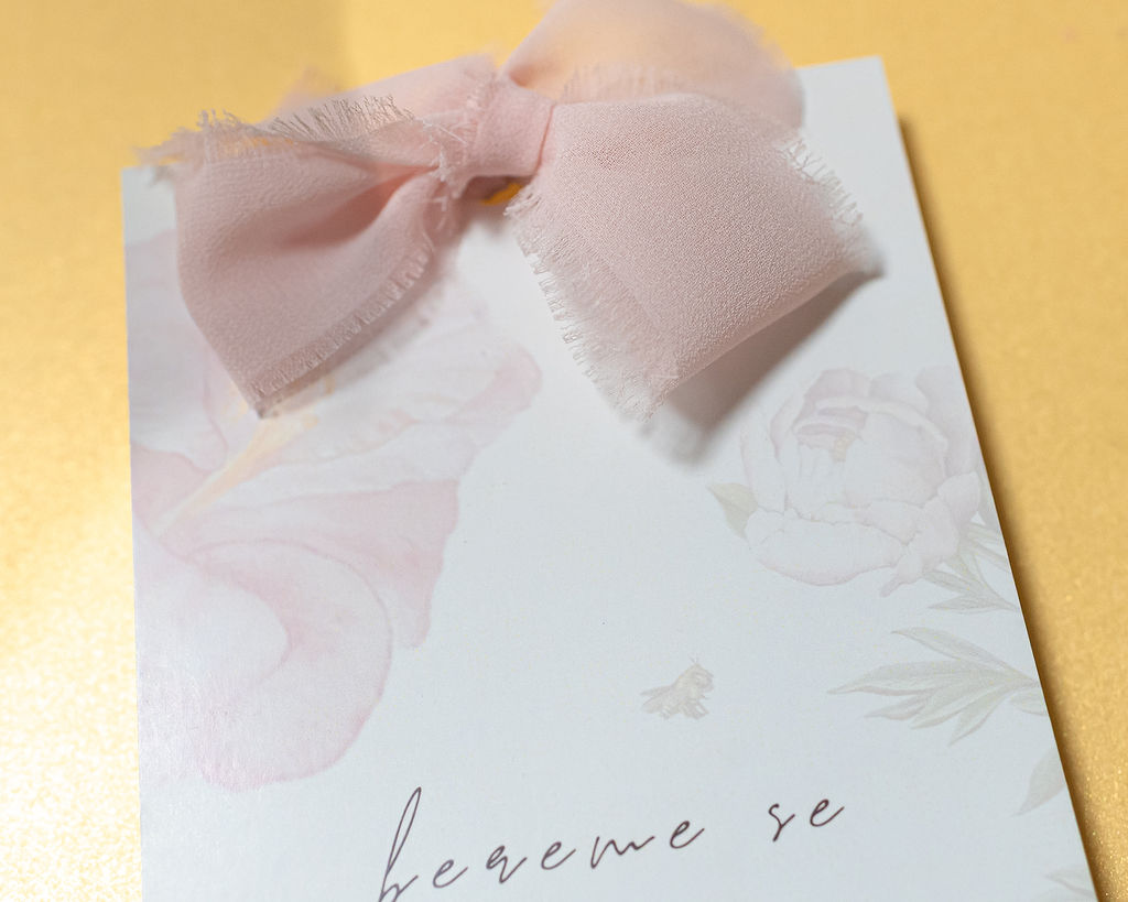 Svadobné oznámenie s ružovou šifónovou mašľou je ideálnou voľbou pre romantické duše, ktoré milujú jemnosť a eleganciu. Ľahká šifónová mašľa pôsobí vzdušne a luxusne zároveň, pričom ružová farba symbolizuje lásku, nežnosť a výnimočné chvíle. Kombinácia kvalitného papiera a precízne viazanej mašle vytvára nežný detail, ktorý očarí každého hosťa už na prvý pohľad.