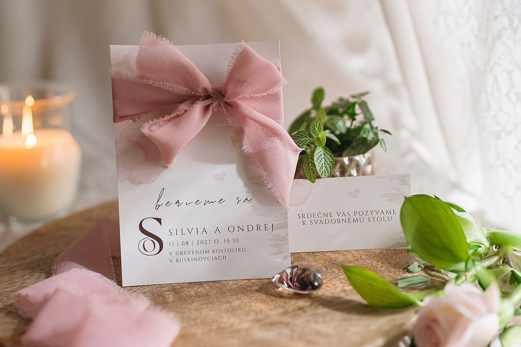 K oznámeniu s rúžovou mašľou vám radi pripravíme aj kompletné svadobné tlačoviny v rovnakom štýle – menovky, menu, zasadací poriadok, etikety či knihu hostí.