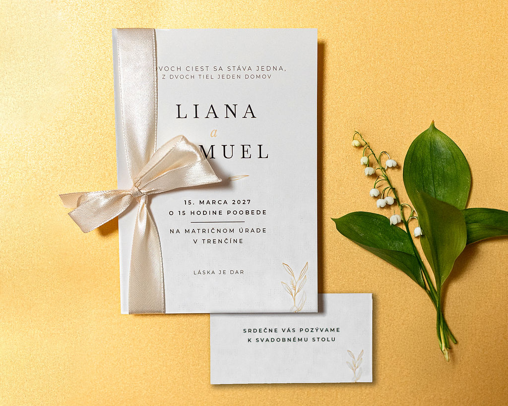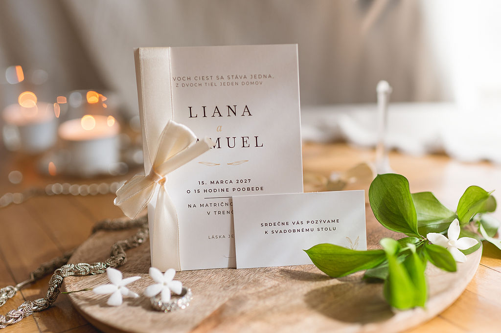Svadobné oznámenie so smotanovou saténovou mašľou je ideálnou voľbou pre páry, ktoré hľadajú jemnú eleganciu a nadčasový štýl. Saténová mašľa v smotanovom odtieni pôsobí luxusne, čisto a veľmi vkusne, pričom krásne dopĺňa svadobnú atmosféru. Kombinácia kvalitného papiera a precízne viazanej mašle vytvára elegantný detail, ktorý očarí každého hosťa už na prvý pohľad.
