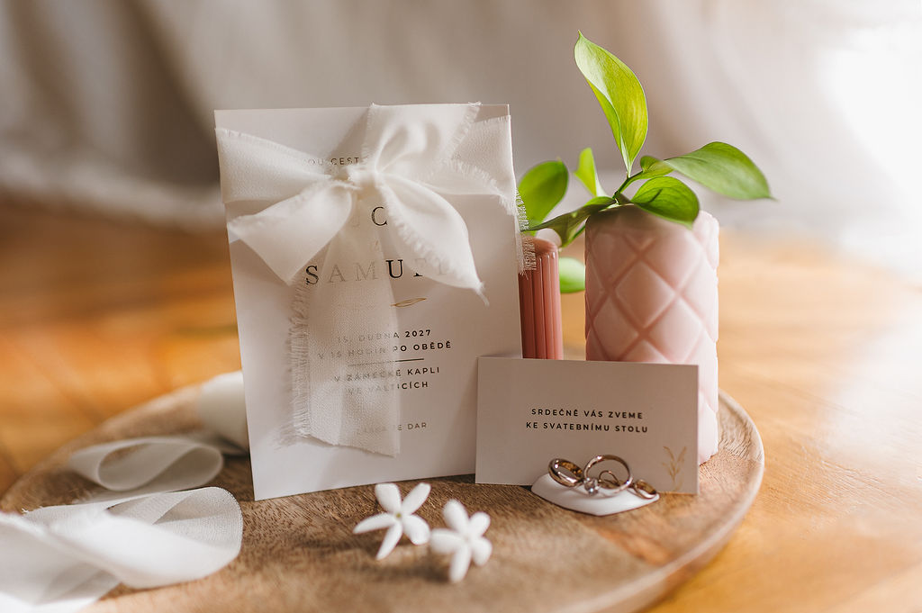 K oznámeniu so smotanovou mašľou vám radi pripravíme aj kompletné svadobné tlačoviny v rovnakom štýle – menovky, menu, zasadací poriadok, etikety či knihu hostí.