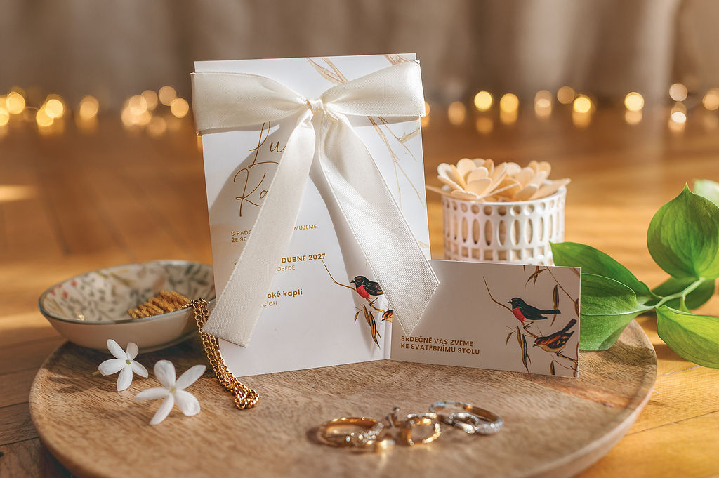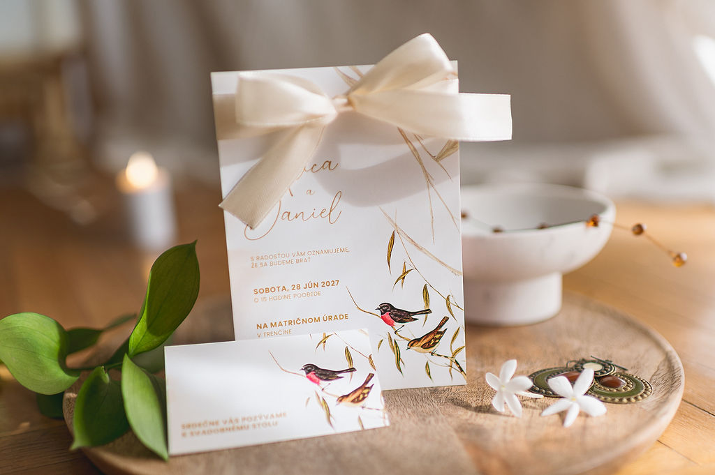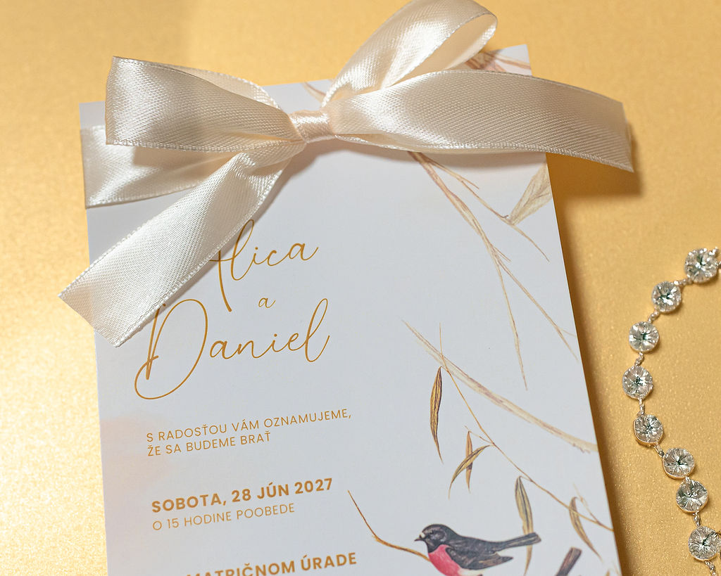 Svadobné oznámenie so smotanovou saténovou mašľou je ideálnou voľbou pre páry, ktoré túžia po nadčasovej elegancii a jemnom luxuse. Saténová mašľa v smotanovom odtieni pôsobí sofistikovane, čisto a veľmi vkusne, pričom podčiarkuje slávnostný charakter oznámenia. Kombinácia kvalitného papiera a precízne viazanej mašle vytvára elegantný detail, ktorý očarí každého hosťa už na prvý pohľad.