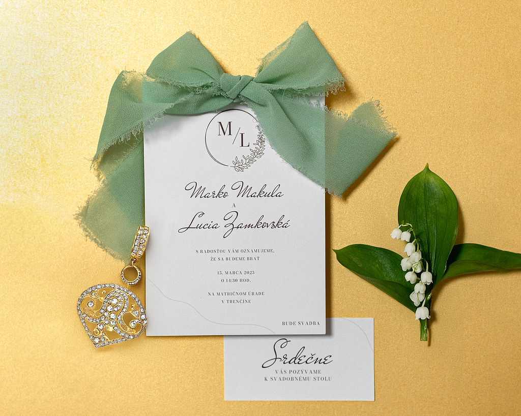 Svadobné oznámenie so zelenou mašľou je ideálnou voľbou pre páry, ktoré túžia po sviežom, elegantnom a prirodzenom vzhľade. Zelená mašľa symbolizuje harmóniu, nový začiatok a spojenie s prírodou, vďaka čomu pôsobí oznámenie jemne, no zároveň výnimočne. Kombinácia kvalitného papiera a precízne viazanej mašle vytvára štýlový detail, ktorý zaujme každého hosťa už na prvý pohľad.