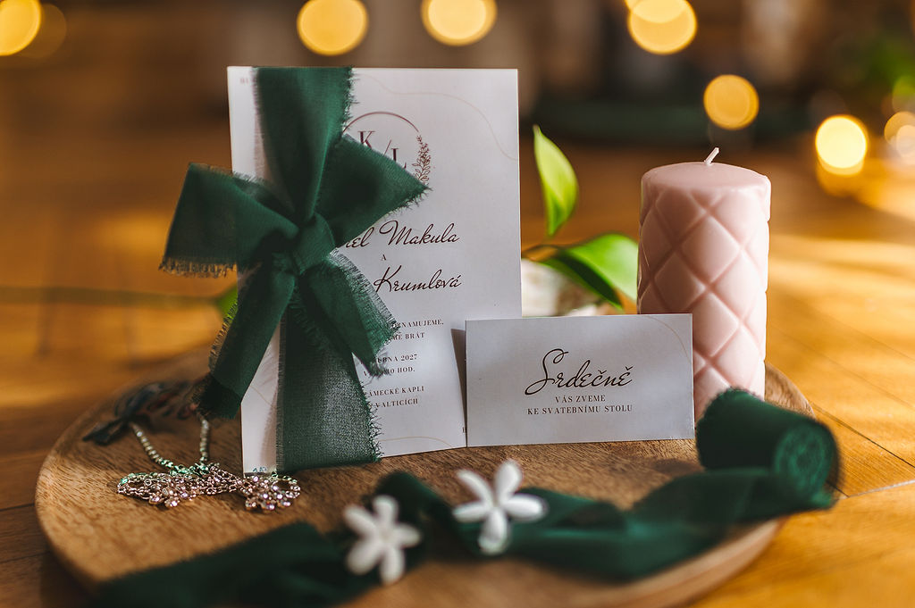 K oznámeniu so zelenou mašľou vám radi pripravíme aj kompletné svadobné tlačoviny v rovnakom štýle – menovky, menu, zasadací poriadok, etikety či knihu hostí.