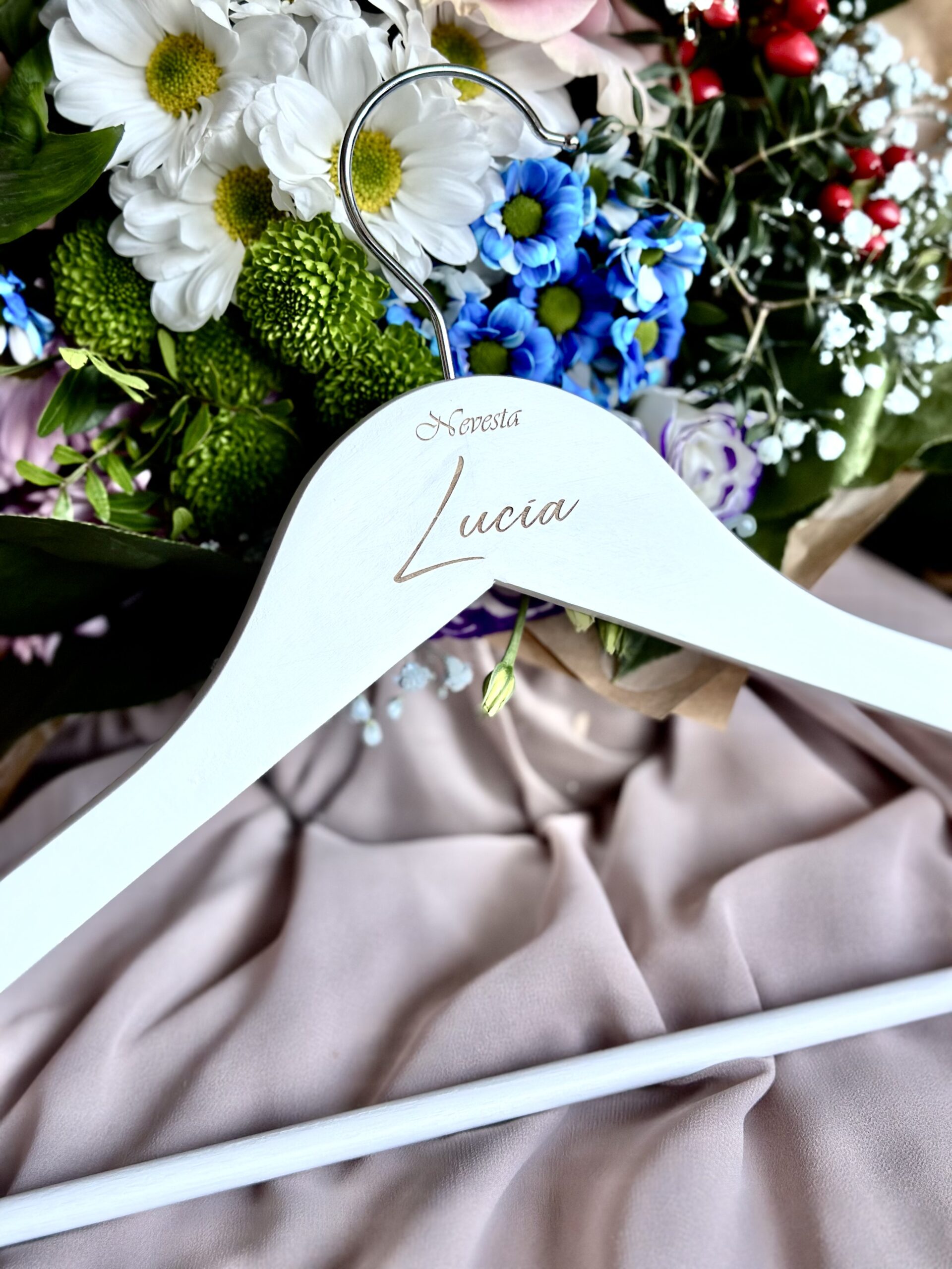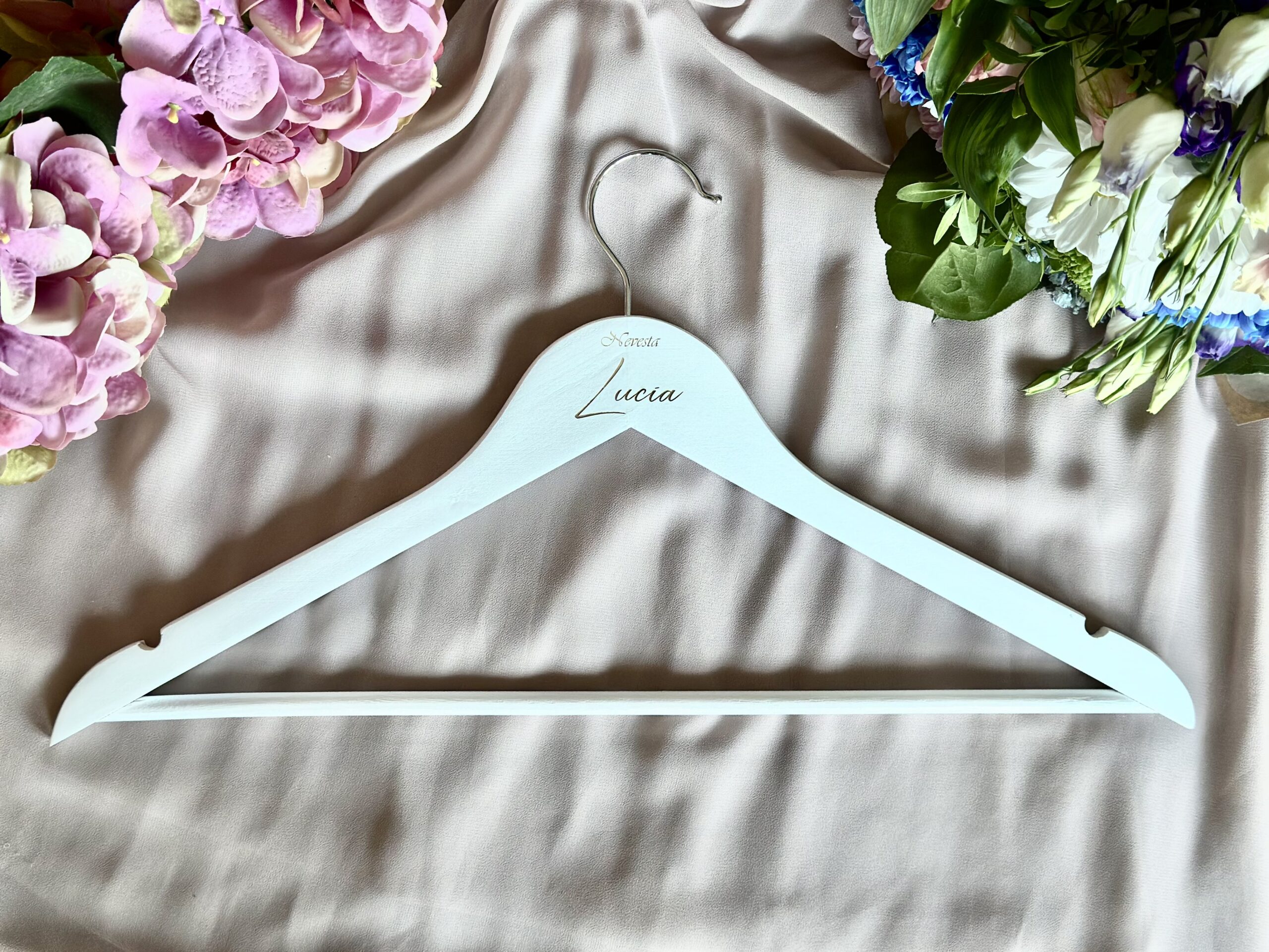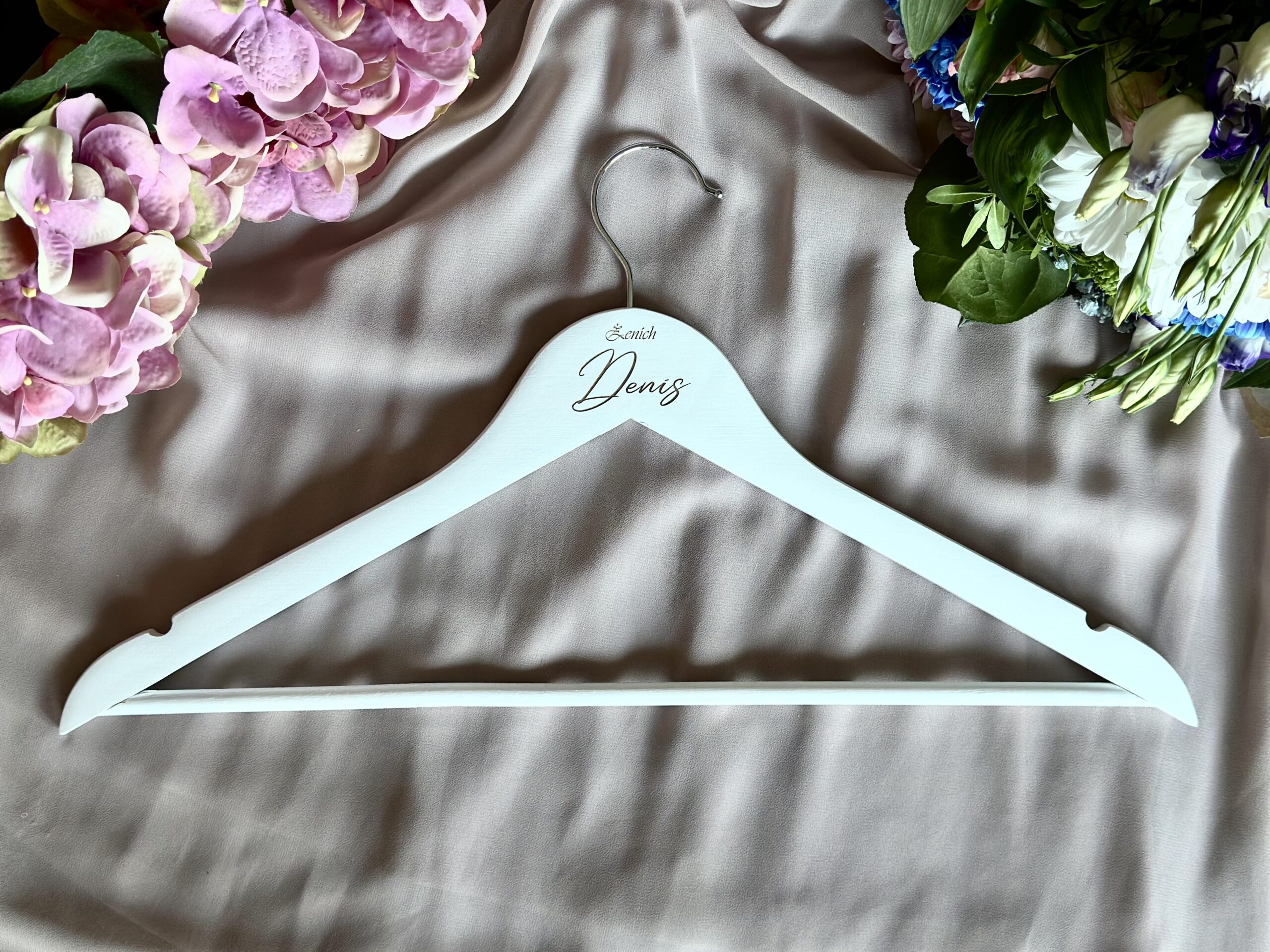 Tento vešiak nie je len praktickým doplnkom na zavesenie svadobných šiat, ale aj krásnou spomienkou, ktorá vám pripomenie váš nezabudnuteľný deň.