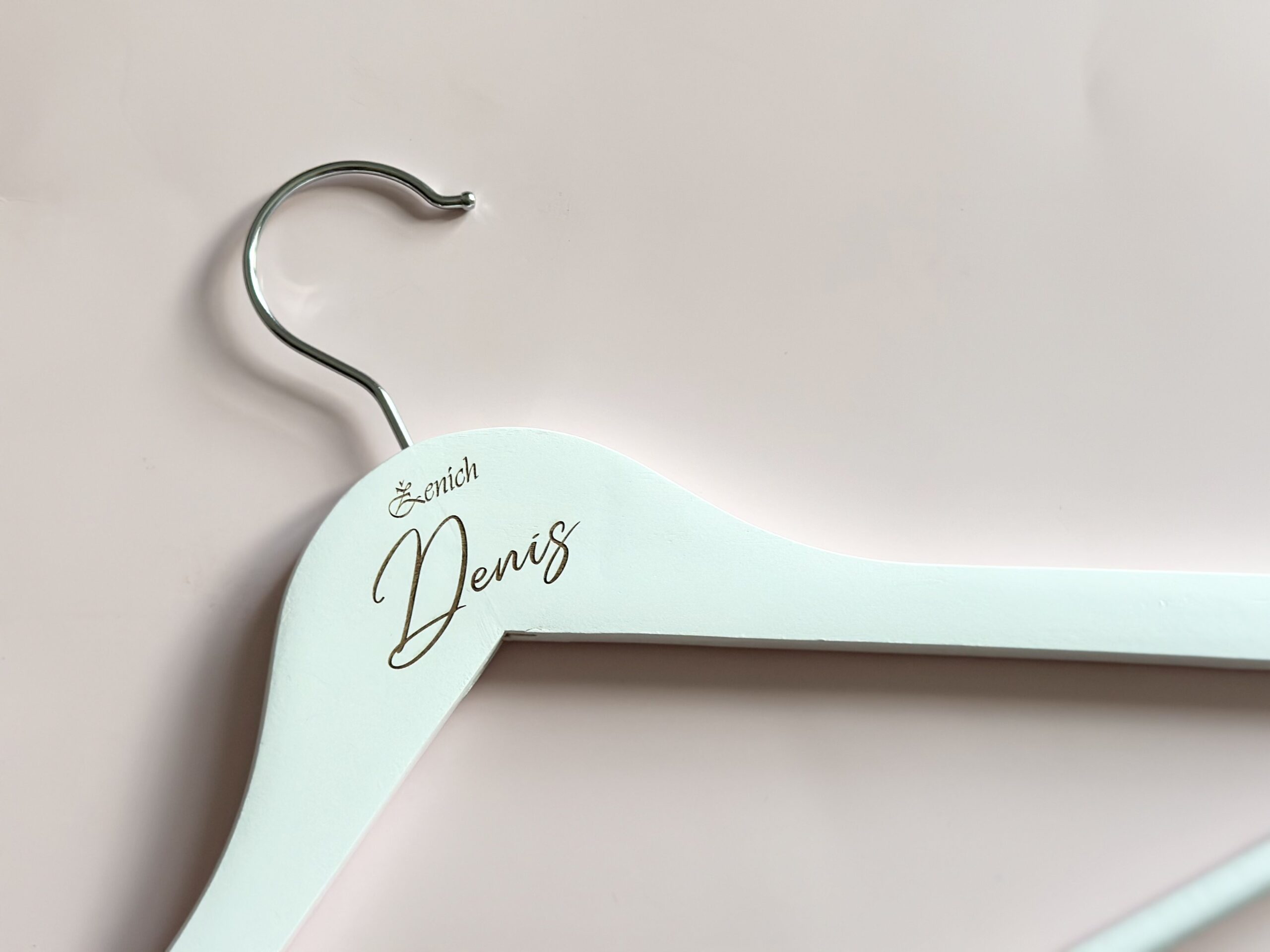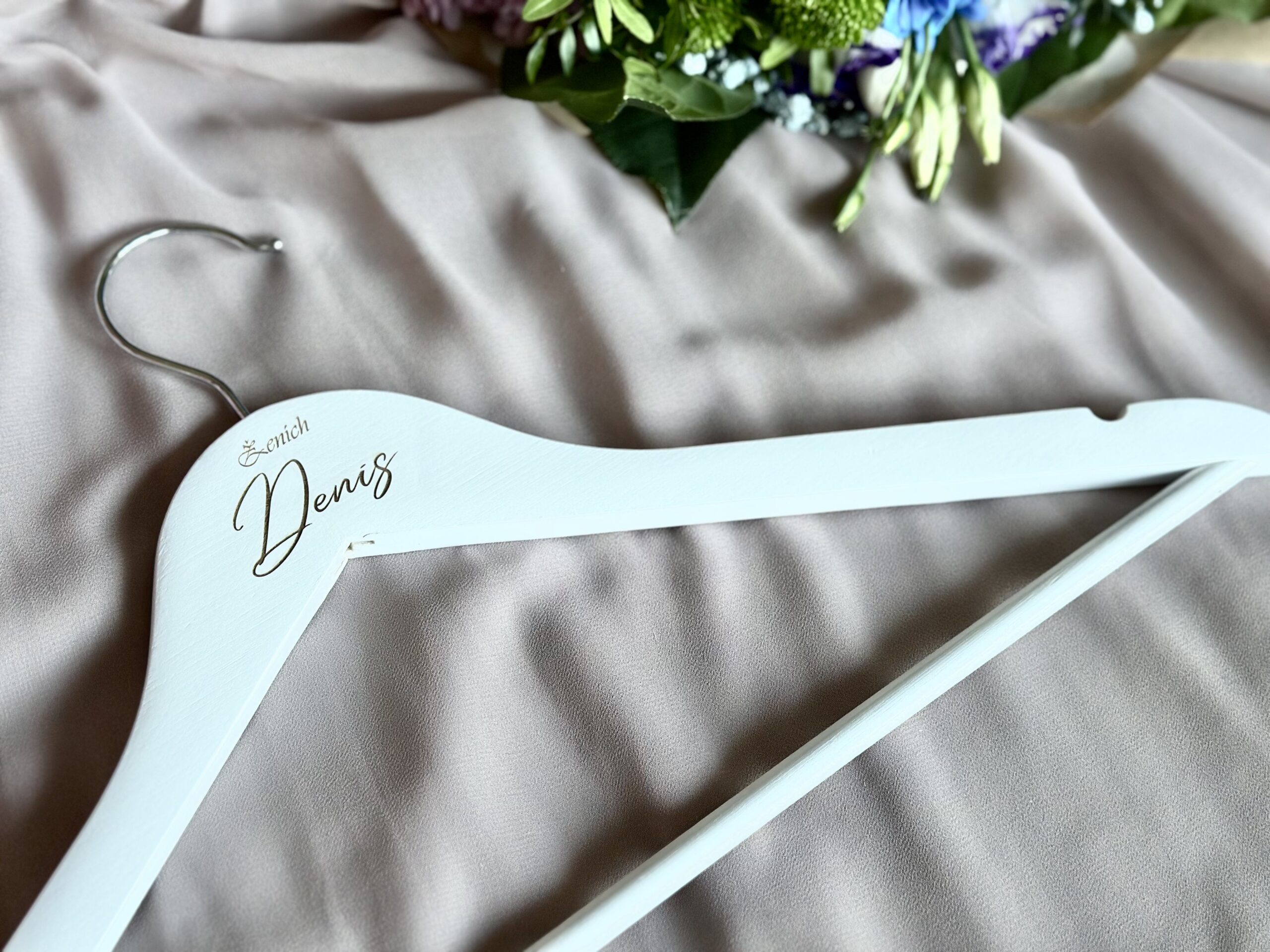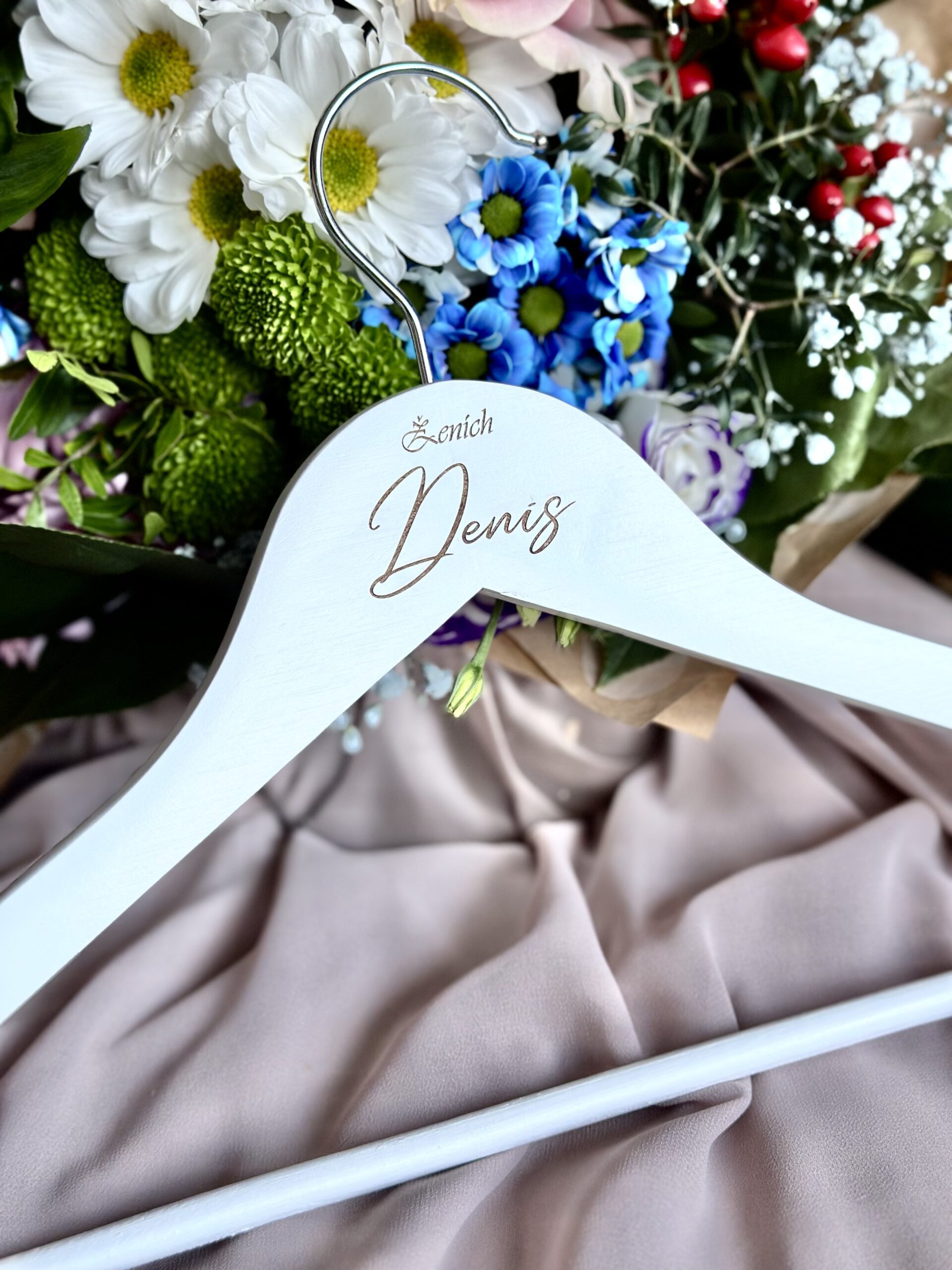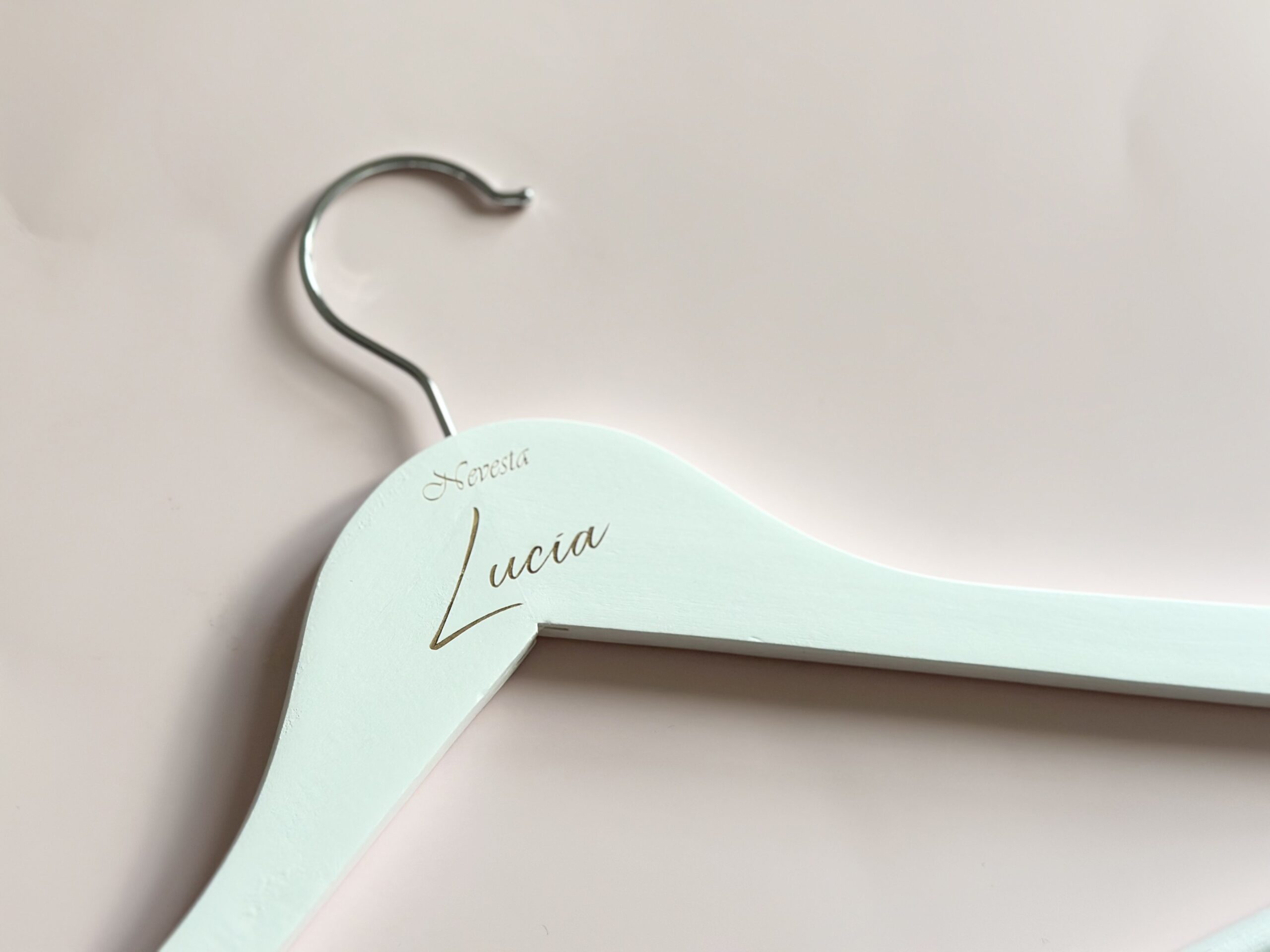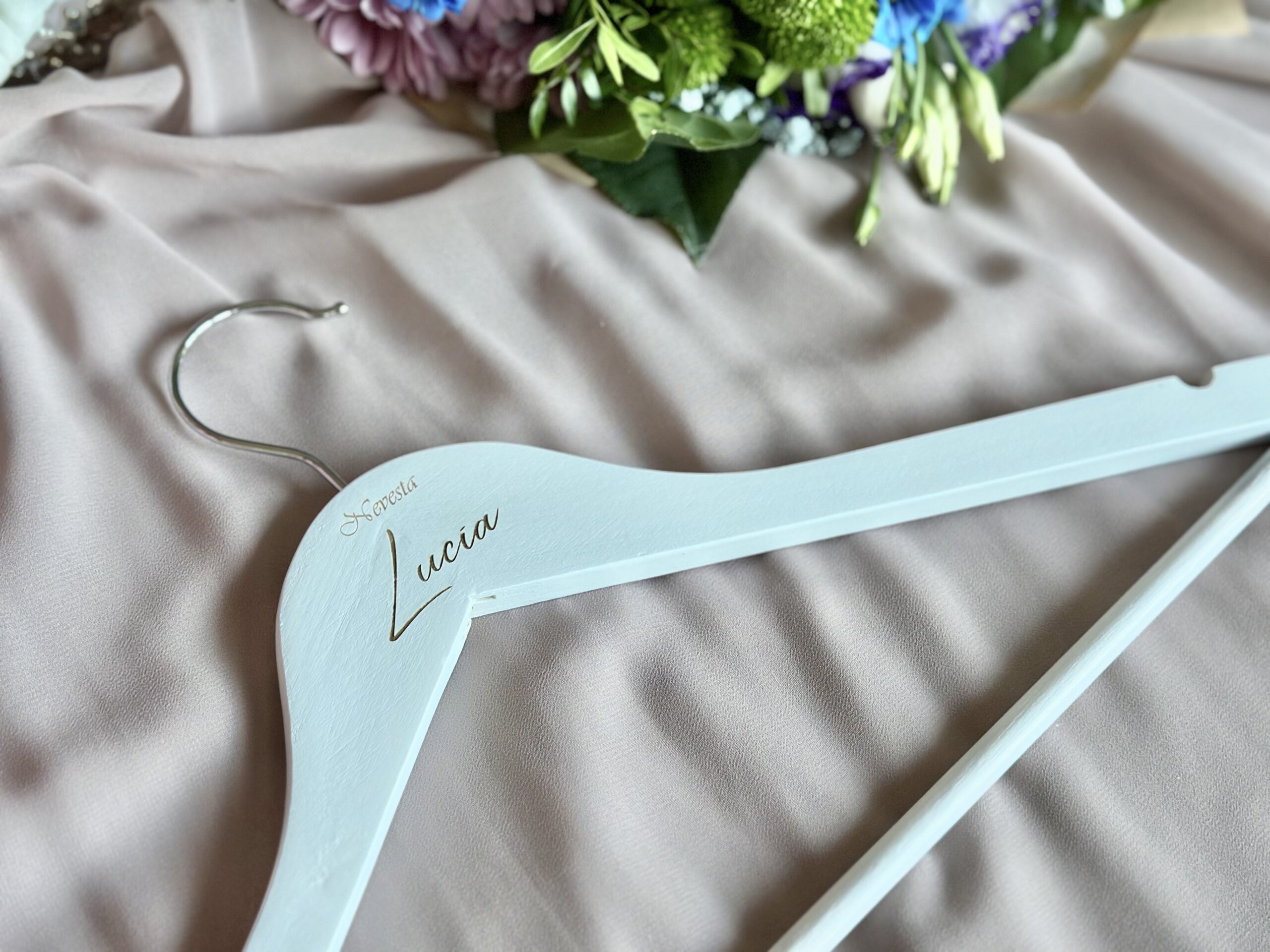 Každý vešiak je starostlivo ručne vyrobený a gravírovaný našimi odborníkmi, ktorí sa zameriavajú na detaily, aby váš svadobný vešiak bol skutočne výnimočný. Gravírovanie je precízne a trvalé, čím zabezpečuje, že váš vešiak bude krásne vyzerať aj po rokoch.