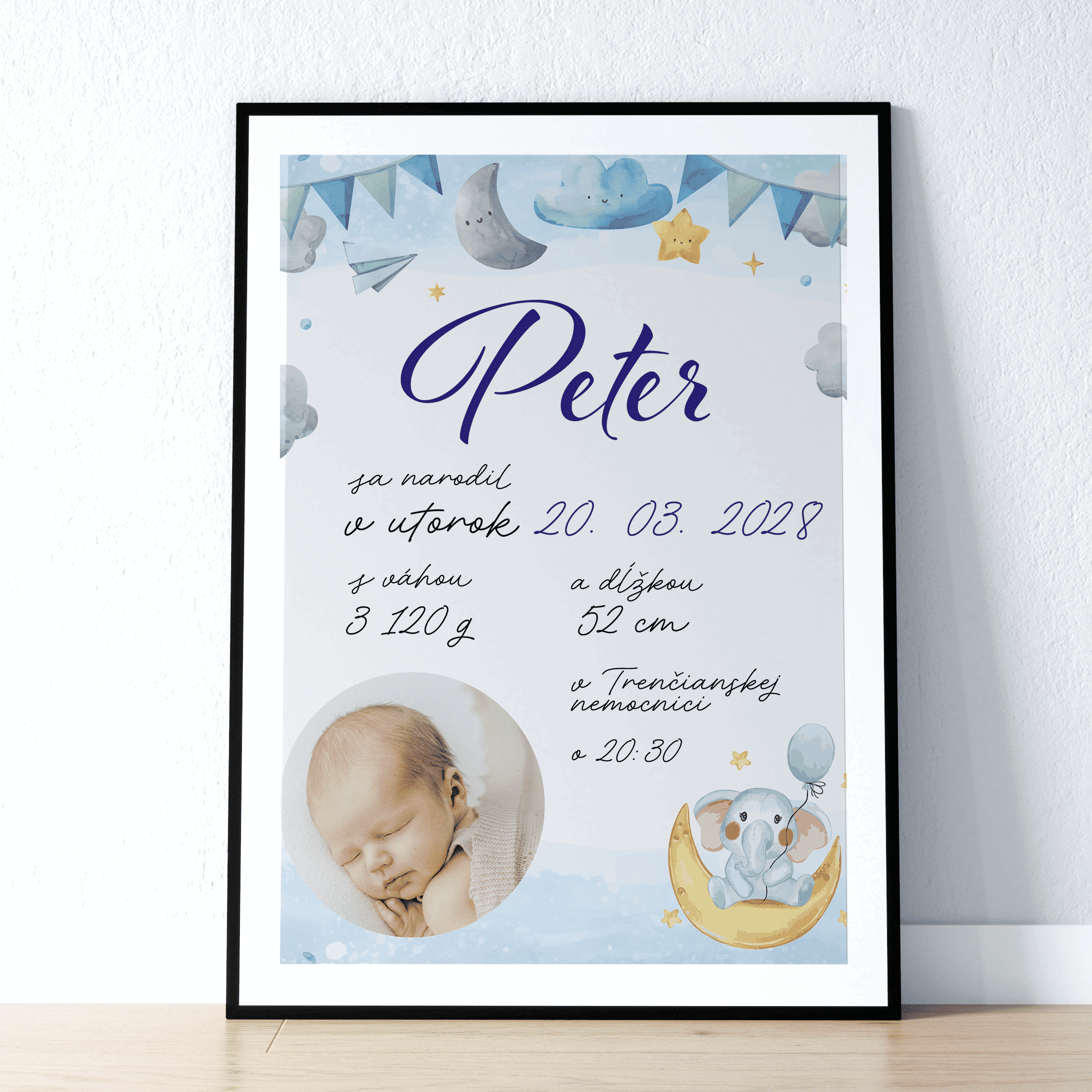 Narodenie dieťaťa je okamih, na ktorý nezabudnete celý život. Aby ste mali tieto vzácne spomienky uchované navždy, pripravíme pre vás originálnu pamätnú tabuľku o narodení. Obsahuje všetky údaje o vašom bábätku a vďaka krásnej grafike sa stane jedinečnou dekoráciou aj darčekom.