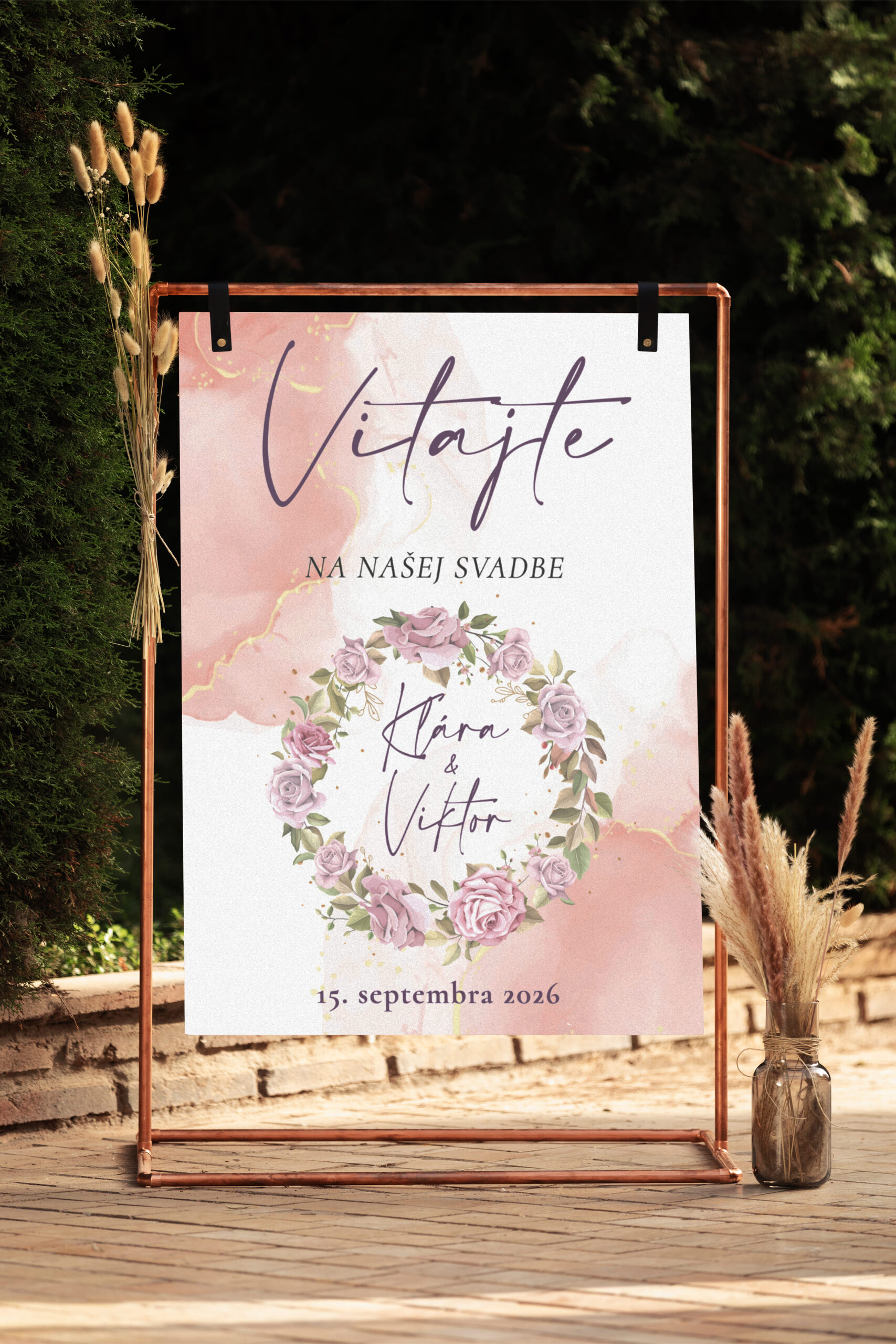 Uvítacia tabuľa na svadbu s ružami a akvarelom LSO2025 0417 – Privítajte svojich hostí štýlovo!