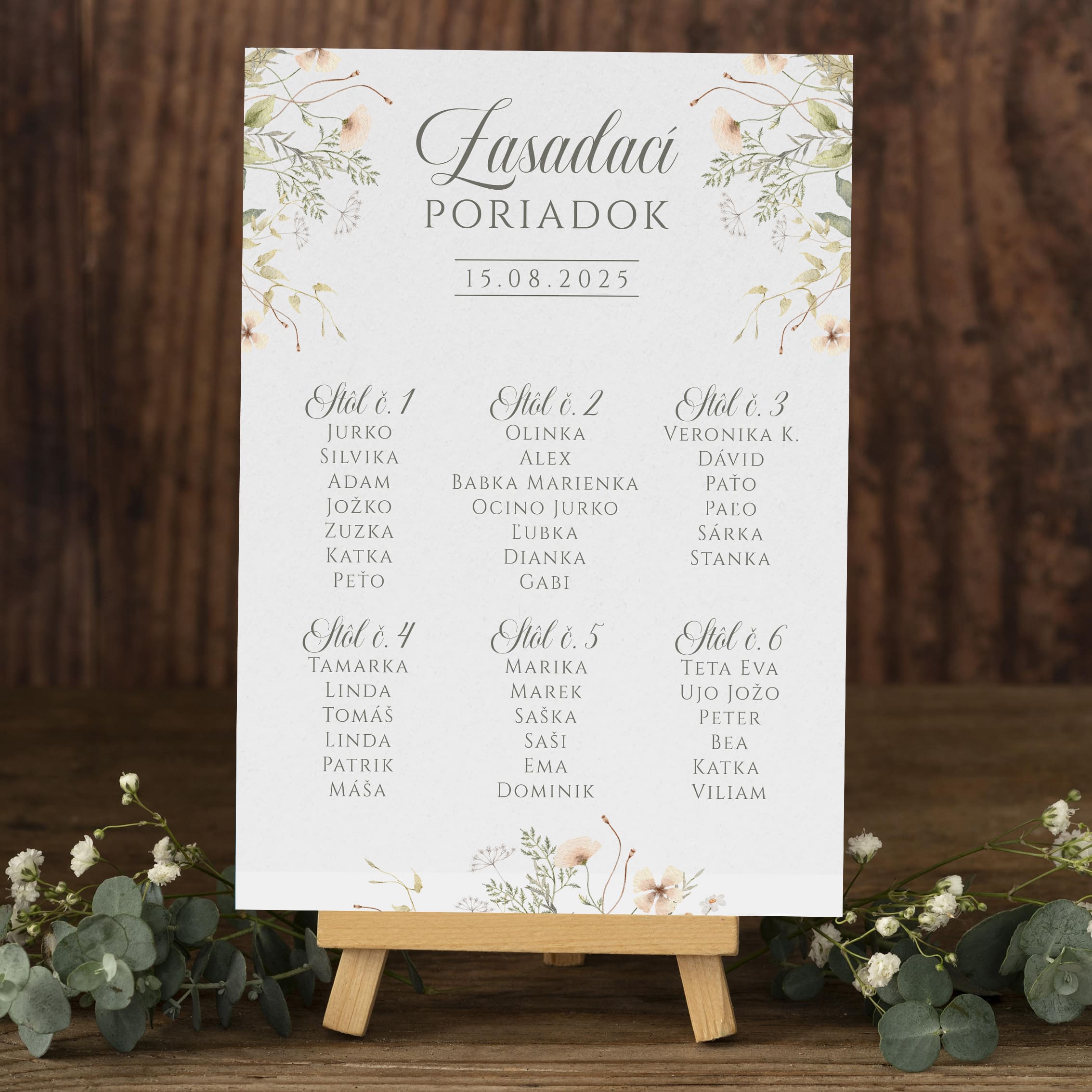 • Jednoduchá orientácia: Jasne označené mená a stoly zabezpečia, že vaši hostia rýchlo nájdu svoje miesto, čím sa eliminuje chaos a zmätok pri vstupe do svadobnej sály.