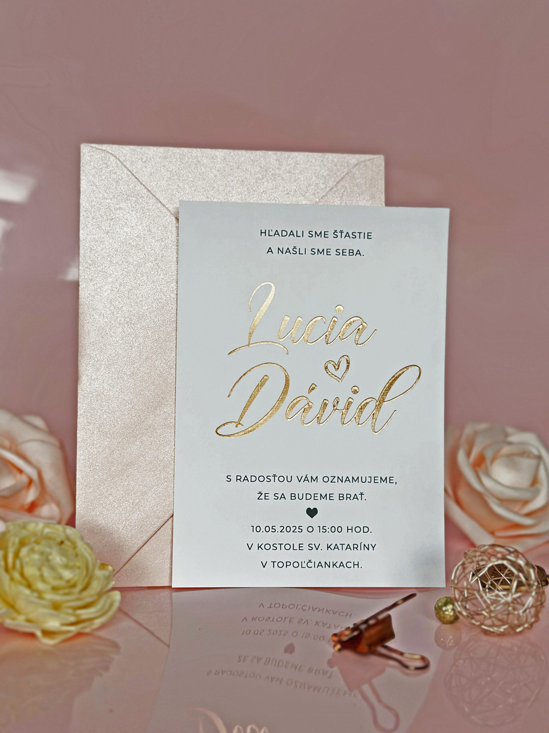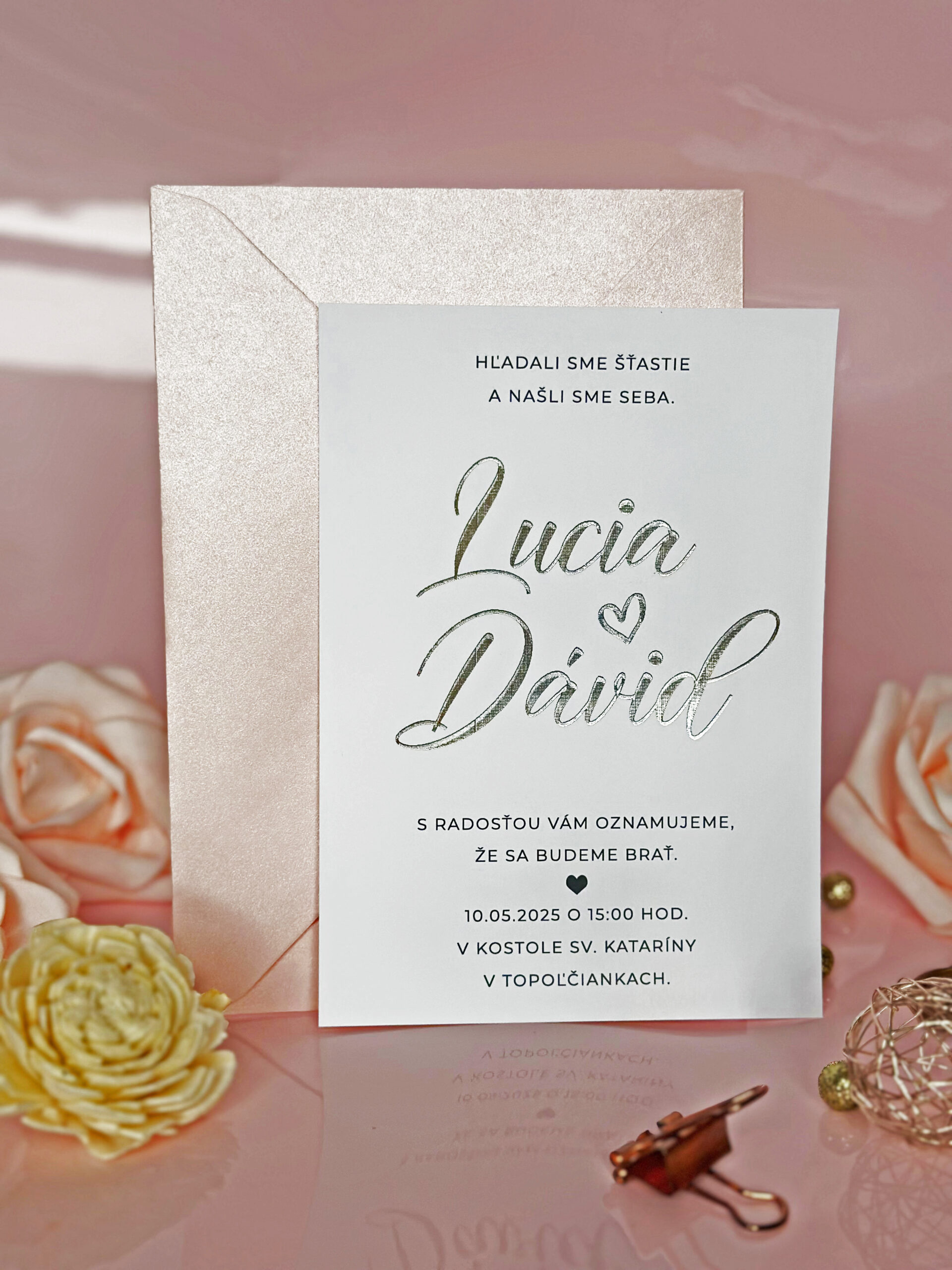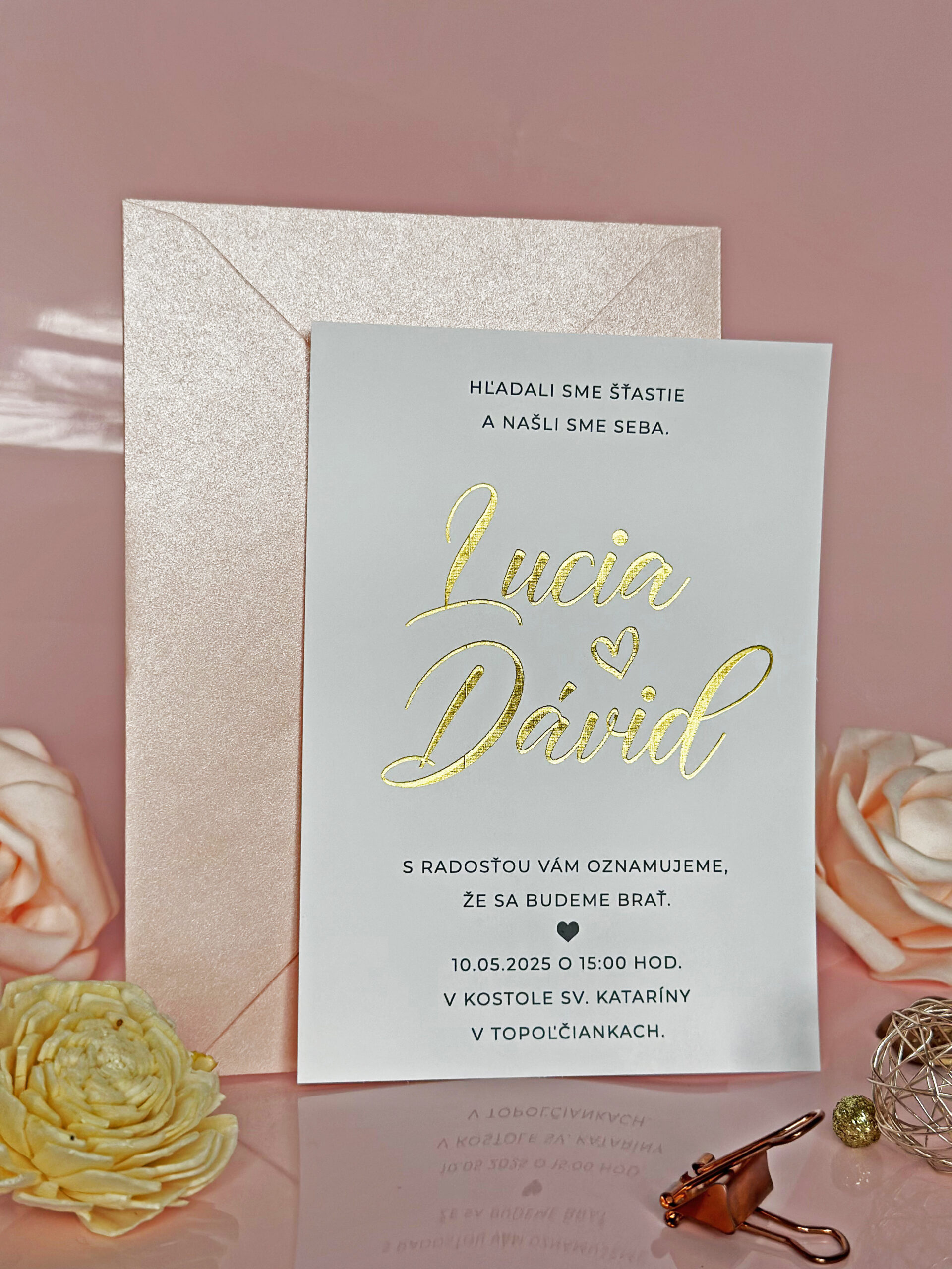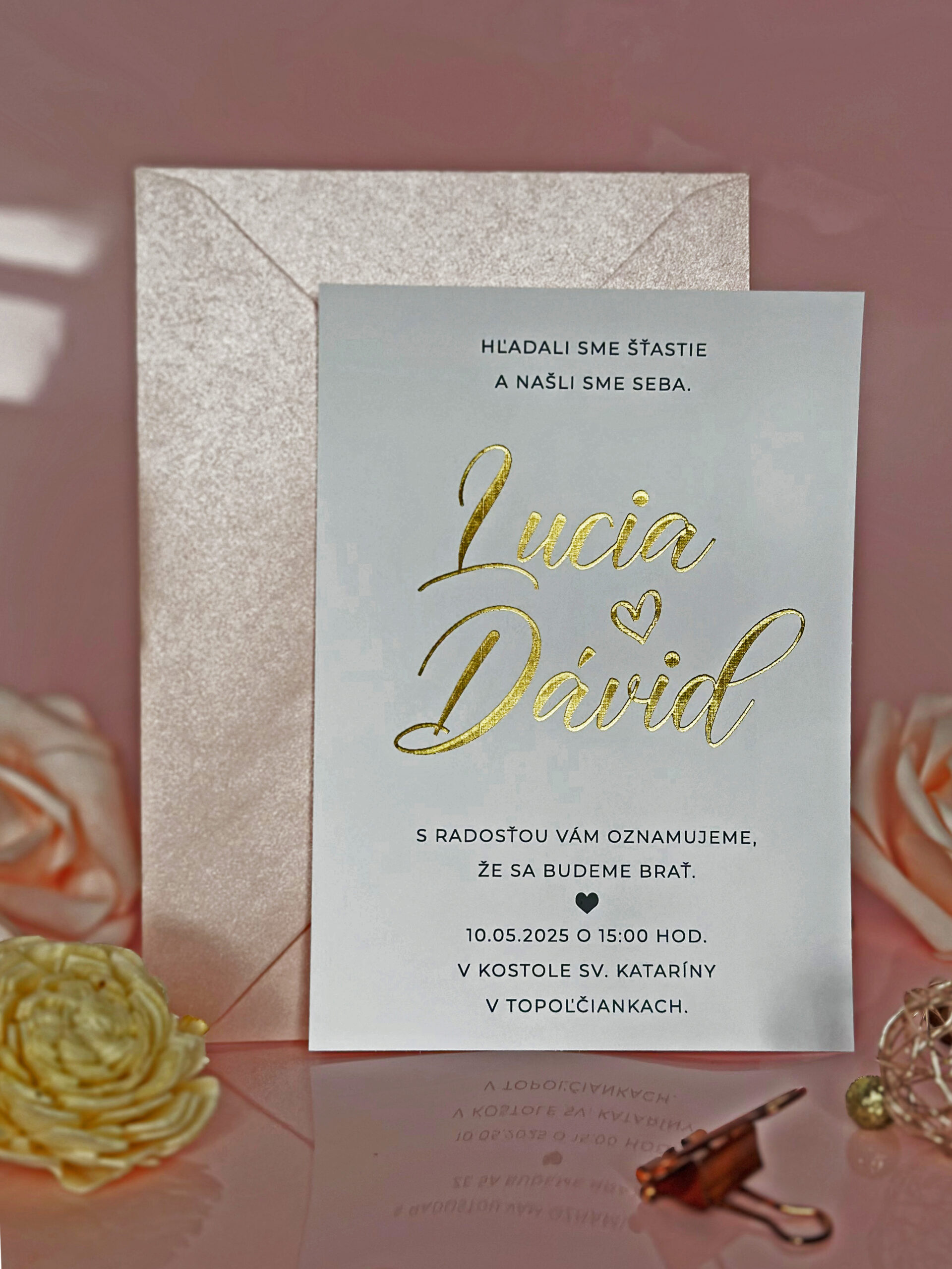 Oživte svoj veľký deň sofistikovaným svadobným oznámením, ktoré zanechá nezabudnuteľný dojem. Naše svadobné oznámenia sú tlačené na kvalitný 300g papier vo formáte A6 a zdobené exkluzívnou metalickou fóliou vo farbách GOLD, SILVER alebo ROSEGOLD.