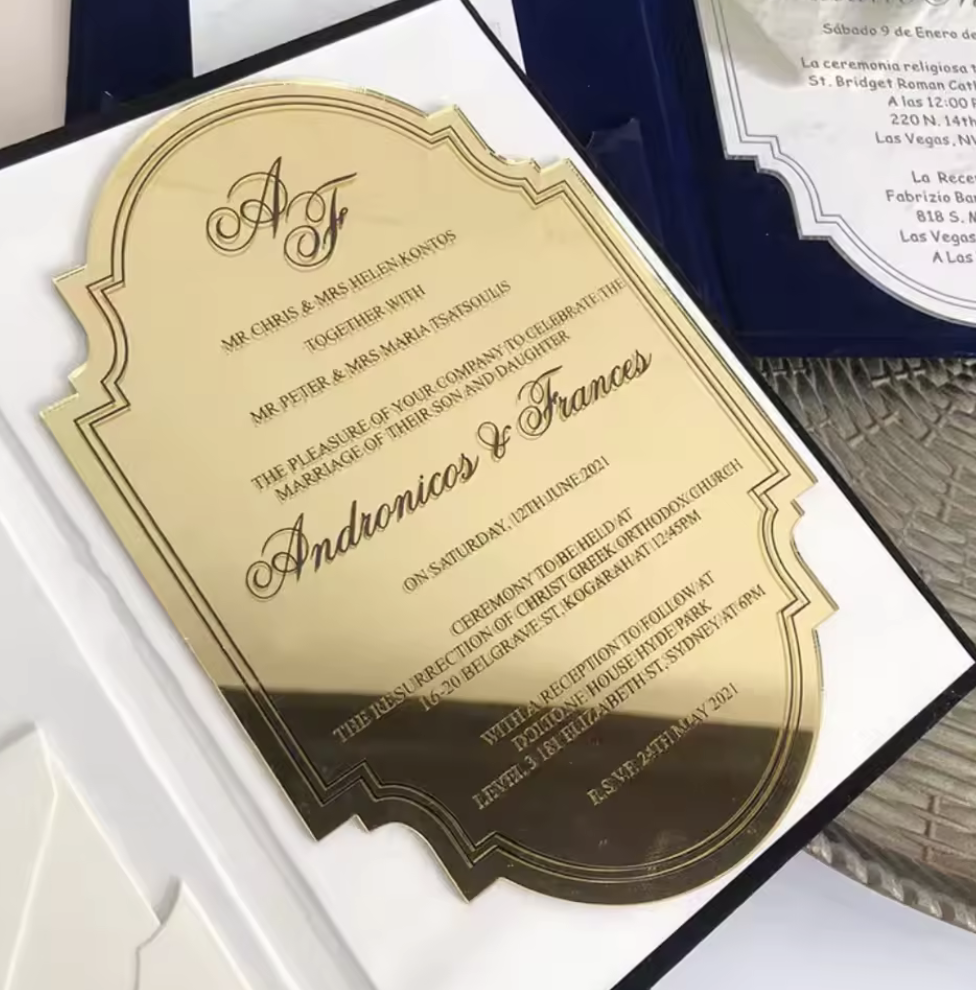 Dajte svojej svadbe honosný, luxusný a neopakovateľný štýl. Naše zrkadlové akrylové oznámenia sú skutočným šperkom medzi svadobnými tlačovinami – žiarivé, elegantné a nezameniteľné. Každý detail pôsobí výnimočne a zanechá dojem, na ktorý sa nezabúda.